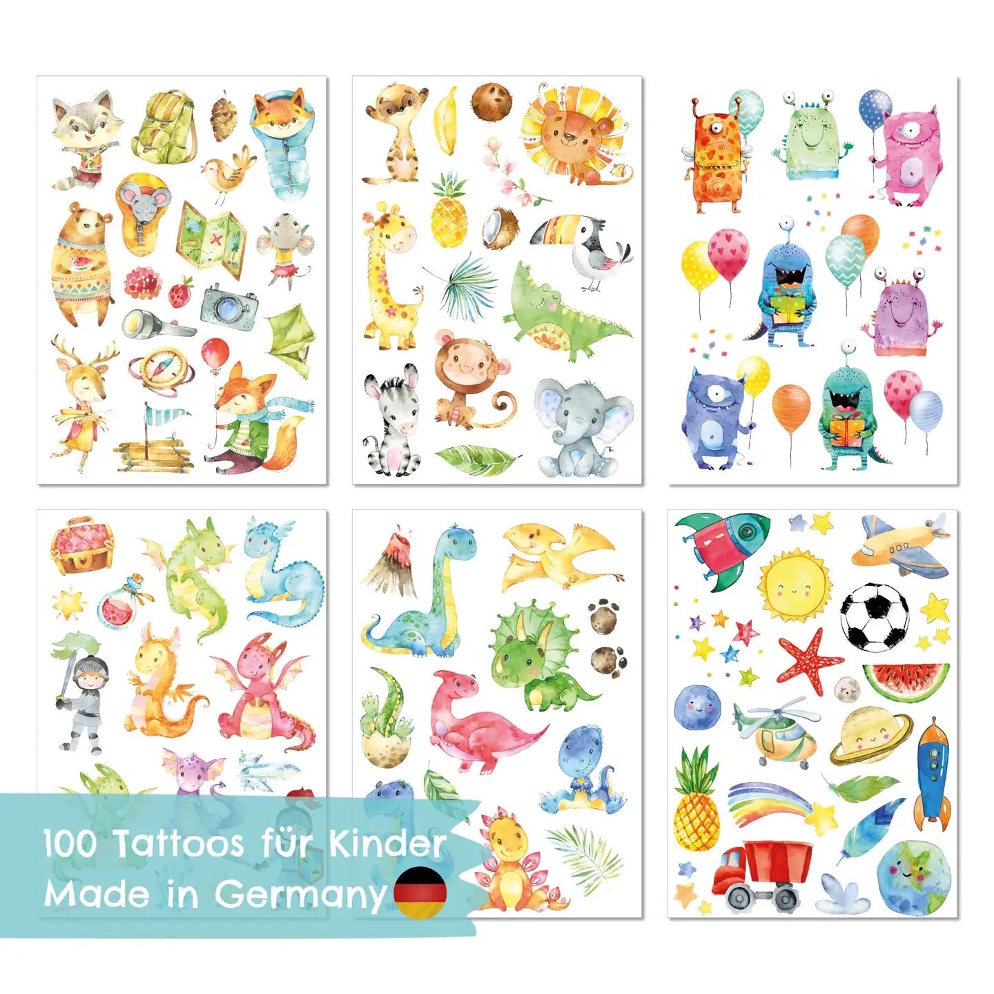 100 barn tatueringar med dinosaurier, monster, drakar, skogsdjur och andra barnvänliga mönster. Dessa tillfälliga tatueringar är helt giftfria och helt säkra för barn. Vi lägger högsta värde på kvaliteten på våra material. Paketet innehåller 6 ark med olika motiv. Tatueringarna är mycket lätta att applicera: klipp ut önskat motiv och ta försiktigt bort skyddsfilmen. Tryck tatueringen nedåt på ren hud och blöt med vatten. Vänta ca 30 sekunder och försiktigt avlägsna papperet och låt sedan tatueringen torka kort. Hållbarheten är 4-6 dagar, beroende på hur ofta tatueringen tvättas med tvål och vatten. För fullständigt avlägsnande rekommenderar vi babyolja.