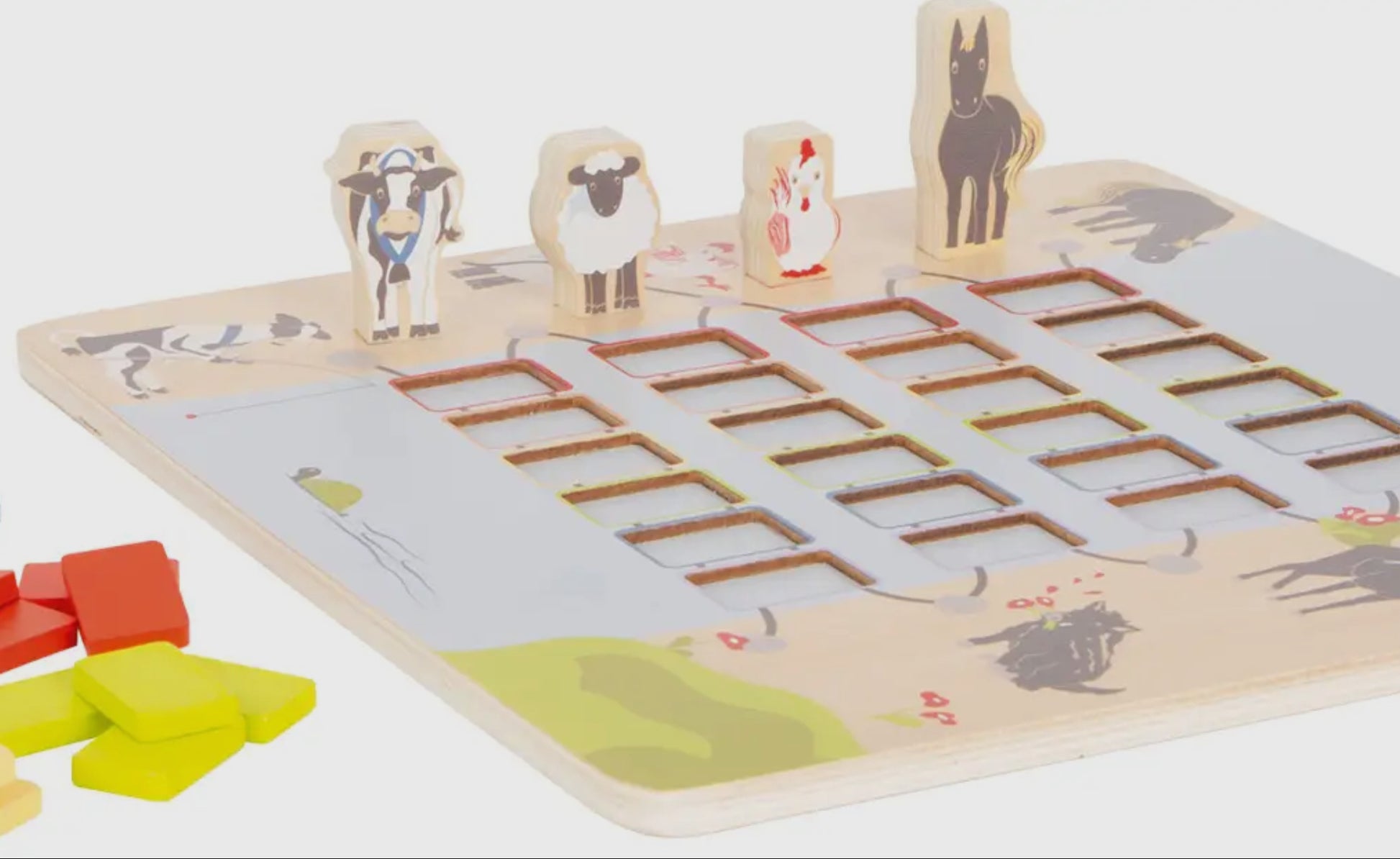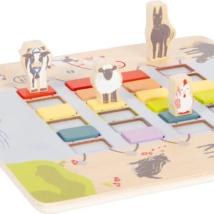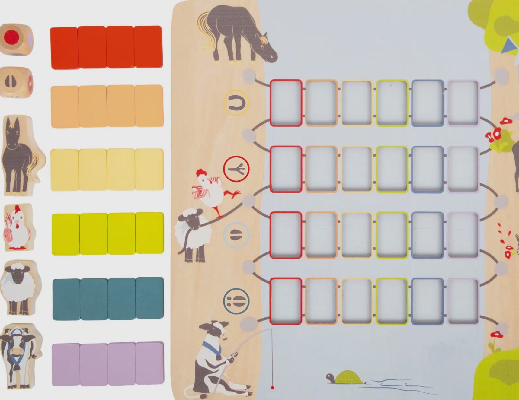 Tuppen Heinz, hästen Fritz, kossan Olga och fåret Schippi vill besöka rådjur och vildsvin i skogen. Målet med spelet är att korsa floden som skiljer gården och skogen! För att göra detta måste var och en av de fyra vännerna bygga en bro av spelbitar i ljusa regnbågsfärger. Med färg- och fotavtryckstärningar samt högkvalitativ lekkartong för förvaring. Förutom det roliga med att leka lär barn på detta sätt vilket djur som har vilket fotavtryck. Spelet kan spelas i tre spelvarianter, som också fungerar utan att räkna och därför också är lämpliga för yngre spelare. Fördjupningar i spelplanen säkerställer att broplattorna ligger säkert och inte glider.