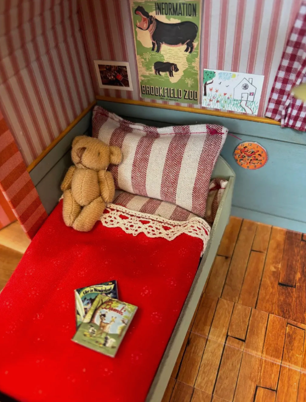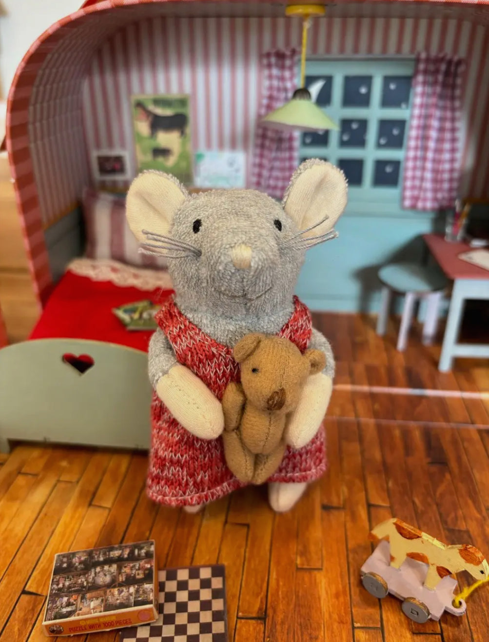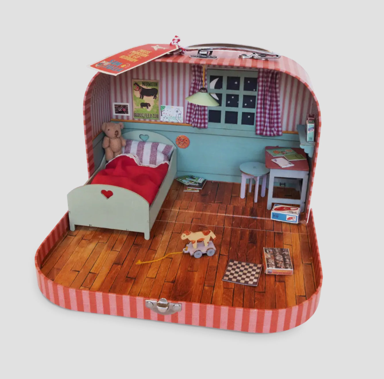 Ta Sam och Julia överallt i den här söta väskan. Väskan är tryckt med tapeter och golv. Sätt enkelt möbelstyckena i varandra och måla möblerna i dina favoritfärger. När det är torrt kan du bädda sängen med den färdiga madrassen, täcket och kudden. Lägg till mini-nallebjörnen som pricken över i:et! Använd klistermärken för att dekorera ditt rum och skapa miniatyrtillbehör av papper, såsom lamphöljen, växter och små lådor. Denna väska är designad av Karina Schaapman, tillverkaren av det ursprungliga Mouse Mansion.