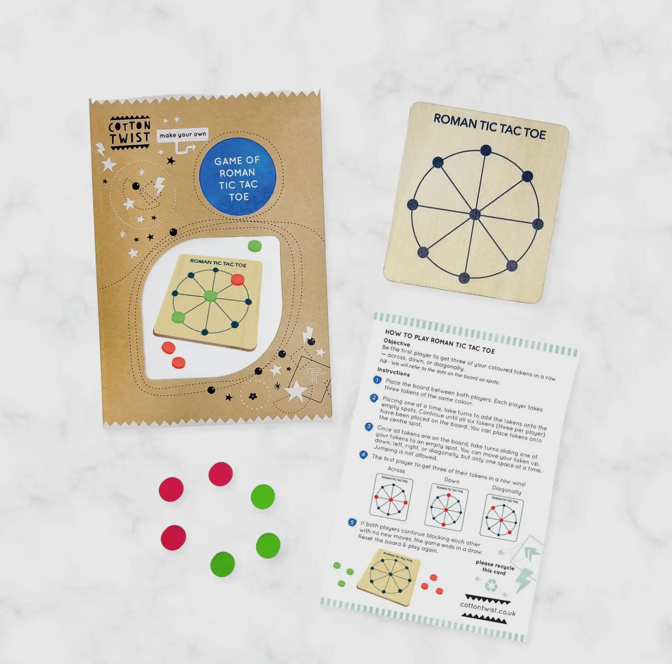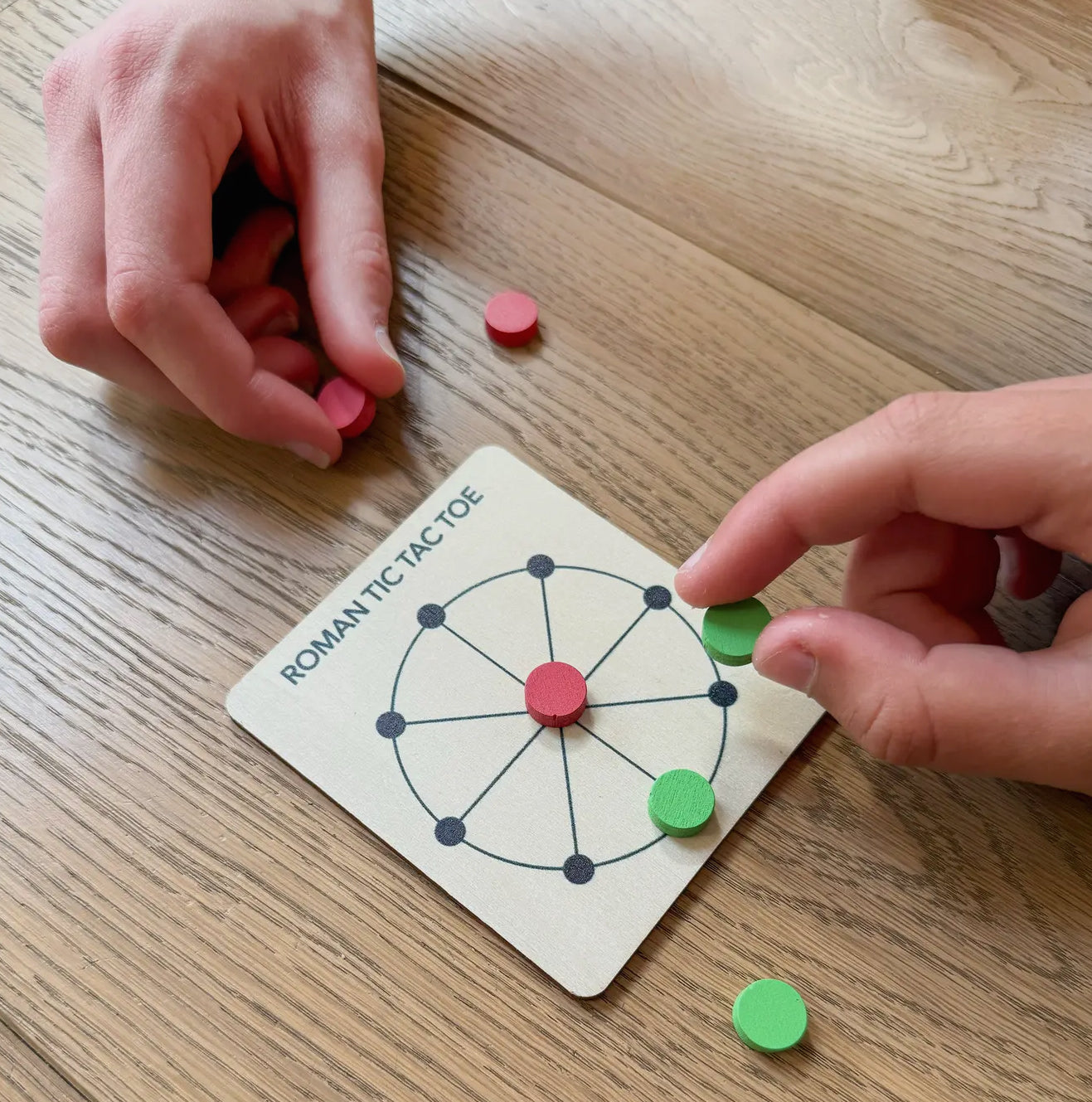 Romerskt tre i rad tar det klassiska tre-i-rad-formatet och ger det en smart historisk twist, perfekt för både nyfikna sinnen och snabba tänkare. Varje spelare turas om att placera och skjuta sina brickor på brädet, med målet att rada upp tre i rad — men när alla brickor är placerade börjar den verkliga kampen! Spelarna måste överlista sin motståndare genom att flytta sina brickor. Det är en lysande introduktion till logik, turordning och taktik, allt inbäddat i ett kompakt, praktiskt spel som är idealiskt för resor, klassrum eller regniga eftermiddagar hemma.