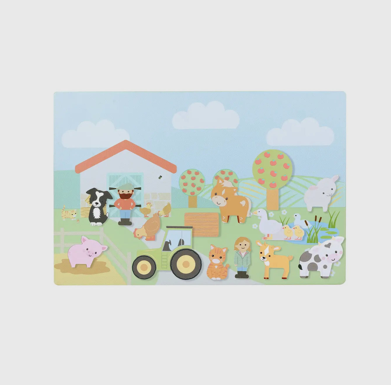 Denna magnetiska bräda har en äng, en lerig inhägnad och en avtagbar dammbit – perfekt för att placera bondgårdsdjuren. Setet innehåller staket, träd, bonden och hans fru, ett urval av olika bondgårdsdjur mm.