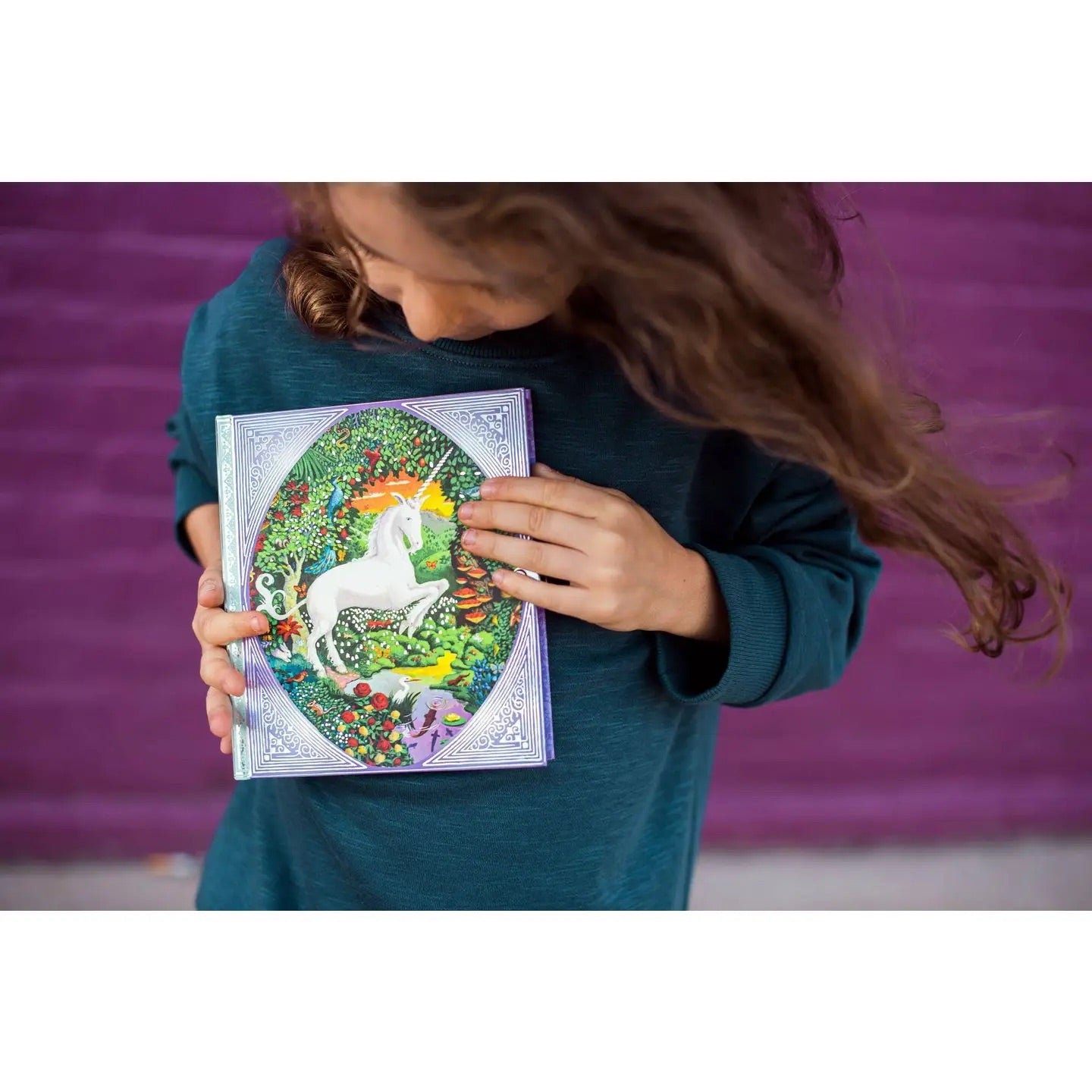 Bli svept in i ett fantastiskt land med denna låsbara dagbok. Enhörningen, inramad av silverfolie, kommer att skydda dina innersta tankar.