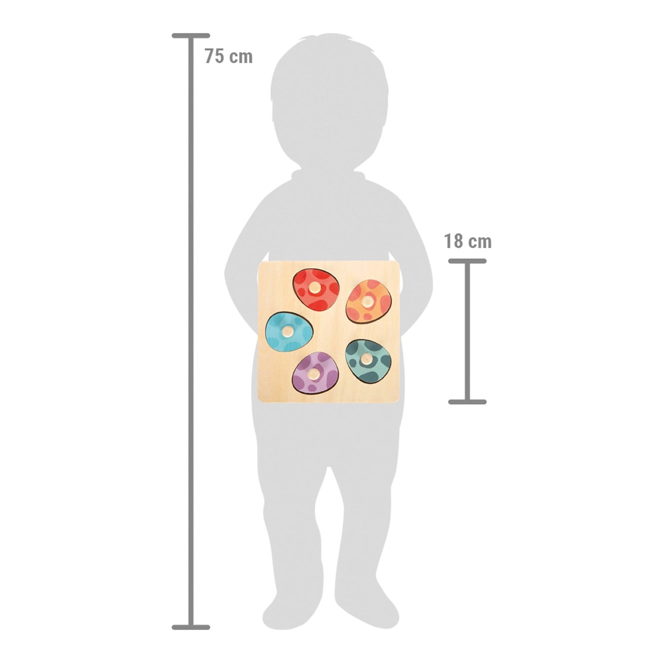 Detta robusta dinosauriepussel tillverkat av FSC® 100% certifierat trä är en mångsidig leksak som är dubbelt så rolig: det är inte bara ett färgstarkt pussel, utan också ett spännande memo-spel. Det kärleksfullt designade småbarnspusslet består av 6 färgglada pusselbitar i form av dinosaurieägg, var och en gömmer en matchande trädinosauriefigur. De små dinosaurierna är en speciell söt överraskningseffekt som gör spelet extra roligt. Pusselbitarna är försedda med praktiska träknappar, som är perfekta för små barns händer. Att greppa och sätta in träpusselbitarna i de förskurna formerna främjar lekfullt finmotorik. Barn lär sig tålamod och uthållighet när de tränar sin koncentration och hand-öga-koordination. Som ett memo är pusslet också ett barnvänligt minne- och minnesspel.