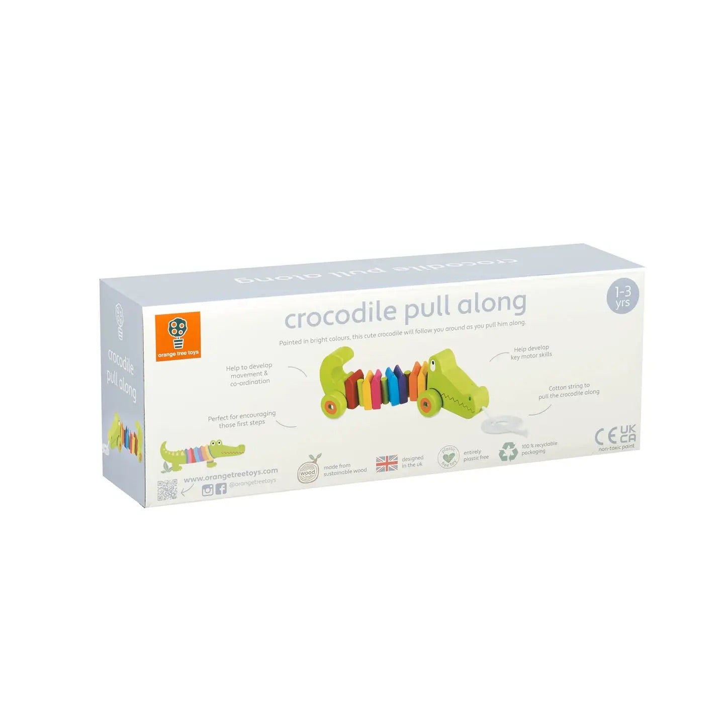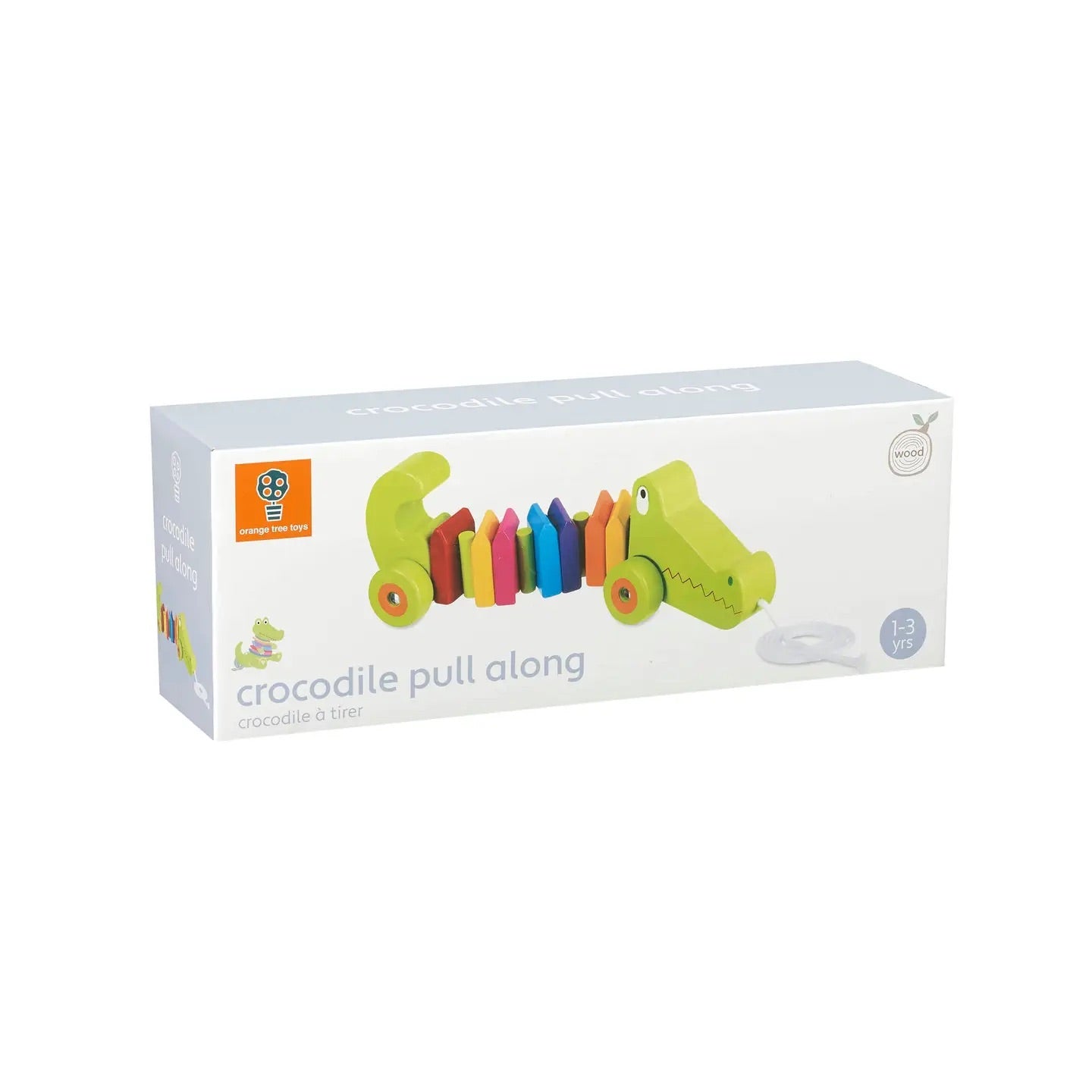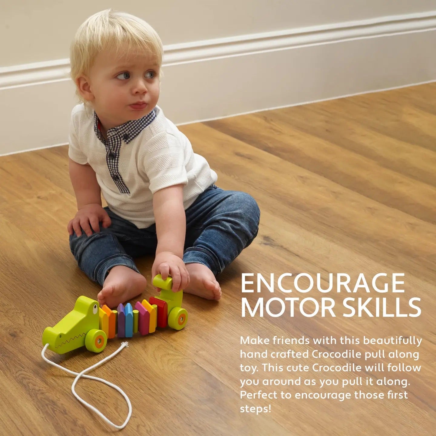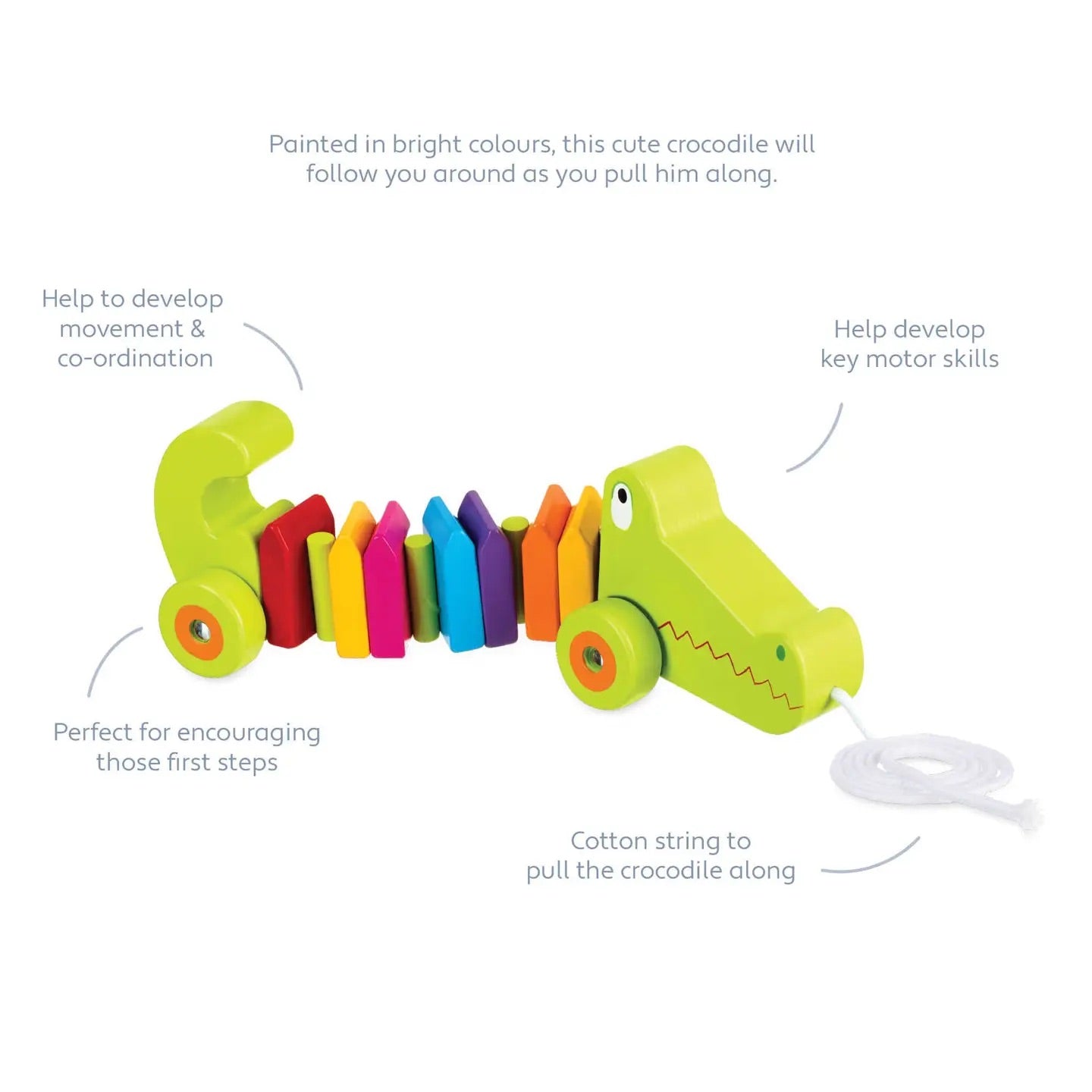 Bli vän med denna vackra dragkrokodil. Målad i ljusa färger kommer denna söta krokodil att följa dig runt när du drar honom med dig. Perfekt för att uppmuntra de första stegen.