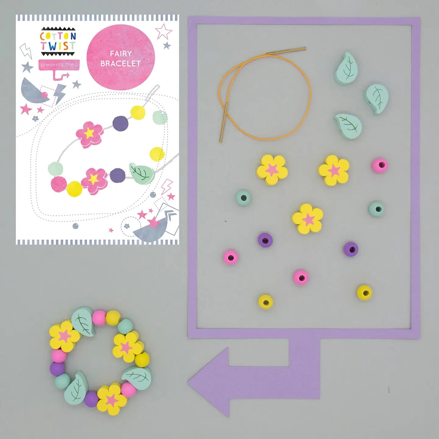 Barn kan pärla sitt eget magiska älvarmband med hjälp av blomma, blad och sfäriska pärlor tillsammans med den medföljande elastiska snöret. Snöret kommer med metalländar för att underlätta pärlandet. I ett försök att förvisa plast från våra hem monteras Cotton Twist -produkter kärleksfullt för hand, och alla komponenter är så bra som vi kan göra dem.