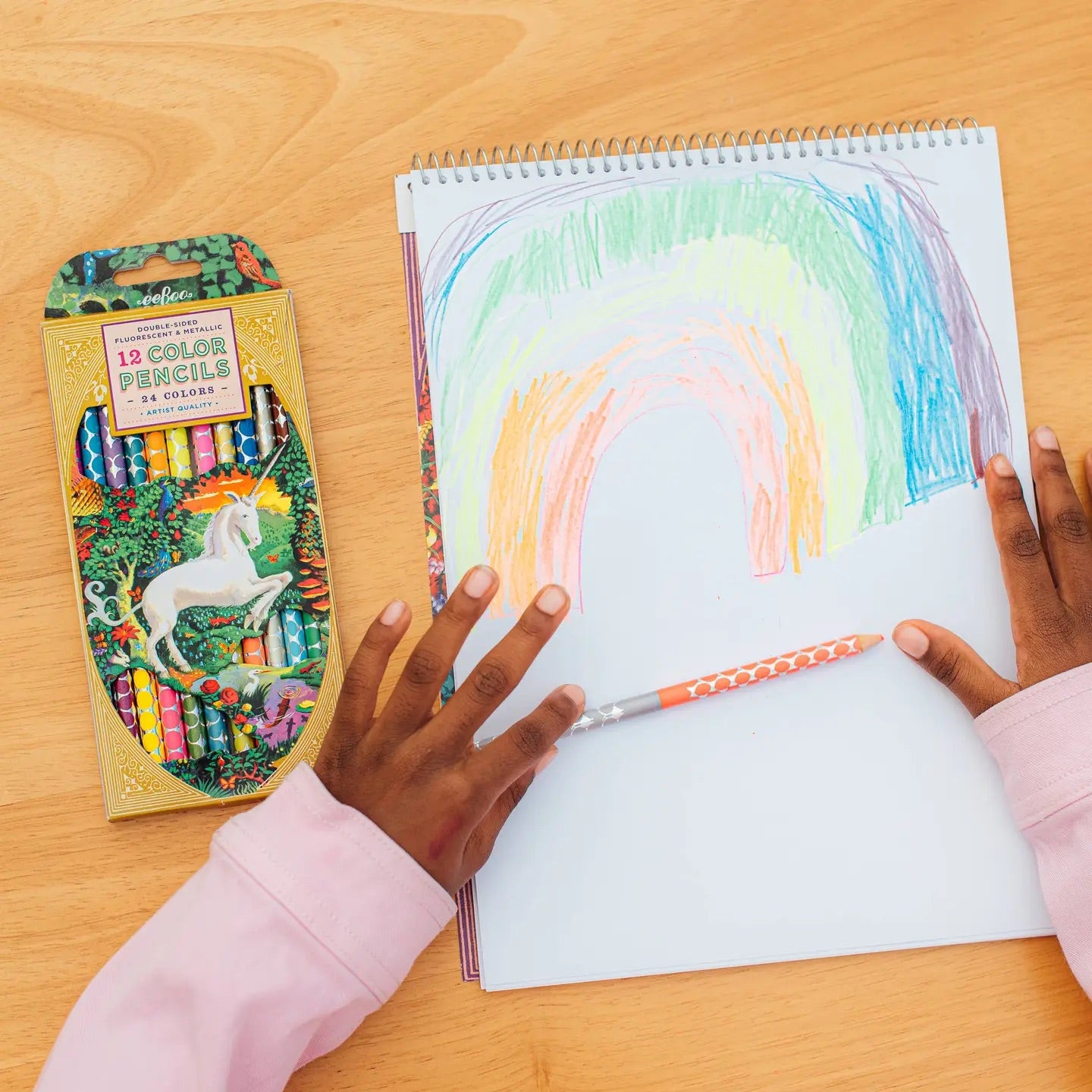 12 högkvalitativa färgpennor med levande fluorescerande och metalliska färger. En underbar gåva till ett barn eller en vuxen. Passar bra med matchande skissbok. Ålder 3+ Inkluderar 12 dubbelsidiga fluorescerande och metalliska färgpennor. Varje penna har glänsande silverfoliemönster. Utvecklar motorik och uppmuntrar kreativitet och fantasi. Säkerhetstestad enligt högsta standard.