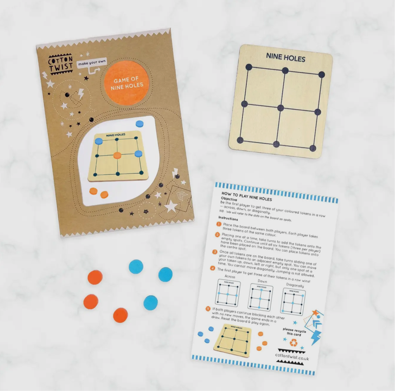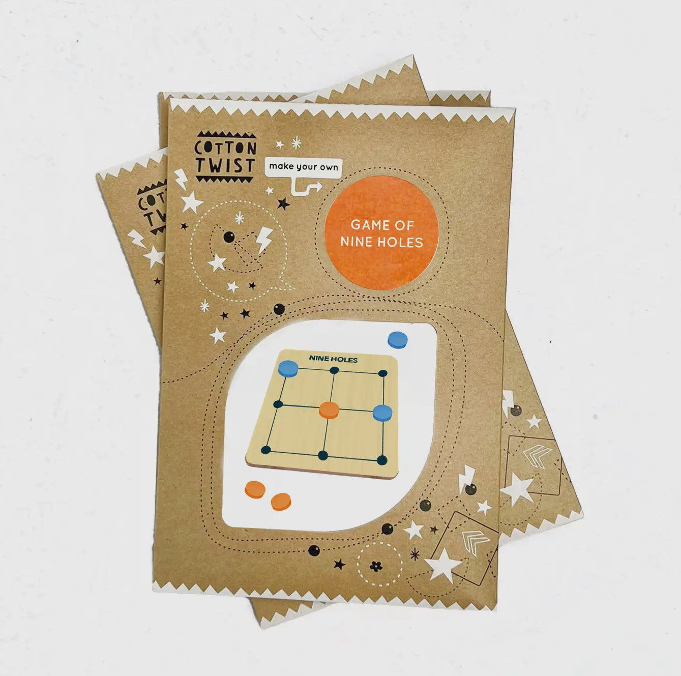 Låt dig inte luras av dess enkelhet — Nine Holes är en snabb, framåttänkande klassiker som handlar om att överlista din motståndare med bara tre brickor var. Turas om att placera dina brickor på nio-rutnätet, och gå sedan in i glidfasen där varje drag räknas. Med inga diagonala drag tillåtna är det en härlig utmaning av logik, planering och smart blockering. Perfekt för resor, kaféer, festpåsar eller efter-skolan-avkoppling. Nine Holes uppmuntrar kritiskt tänkande och taktiskt spel, allt i ett format som är snabbt att sätta upp och oändligt spelbart.