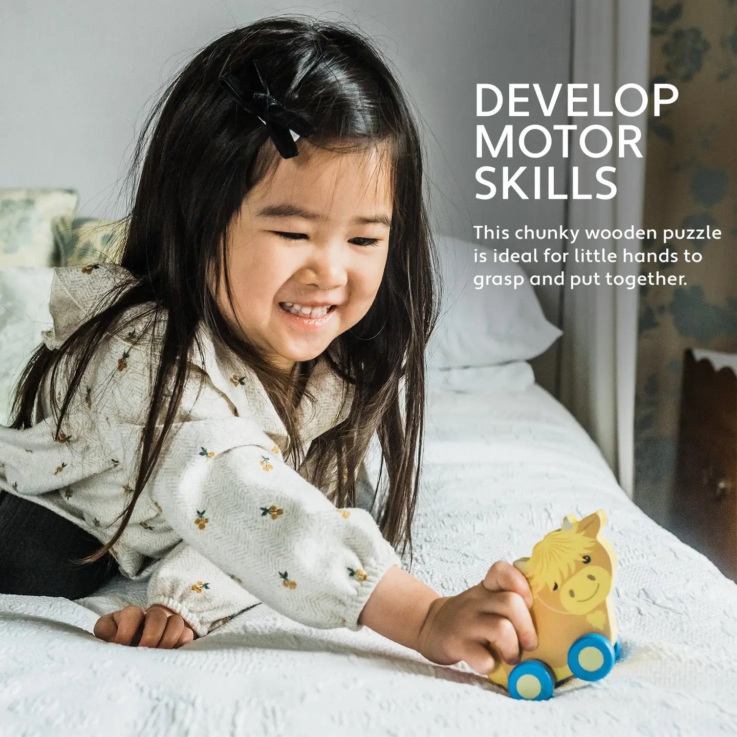 En Highland cow på hjul, perfekt för små händer att köra med. Denna lilla ko är utmärkt för att uppmuntra fantasifull och social lek, samt utveckla viktiga motoriska färdigheter. Tillverkad helt av FSC® -certifierat trä.