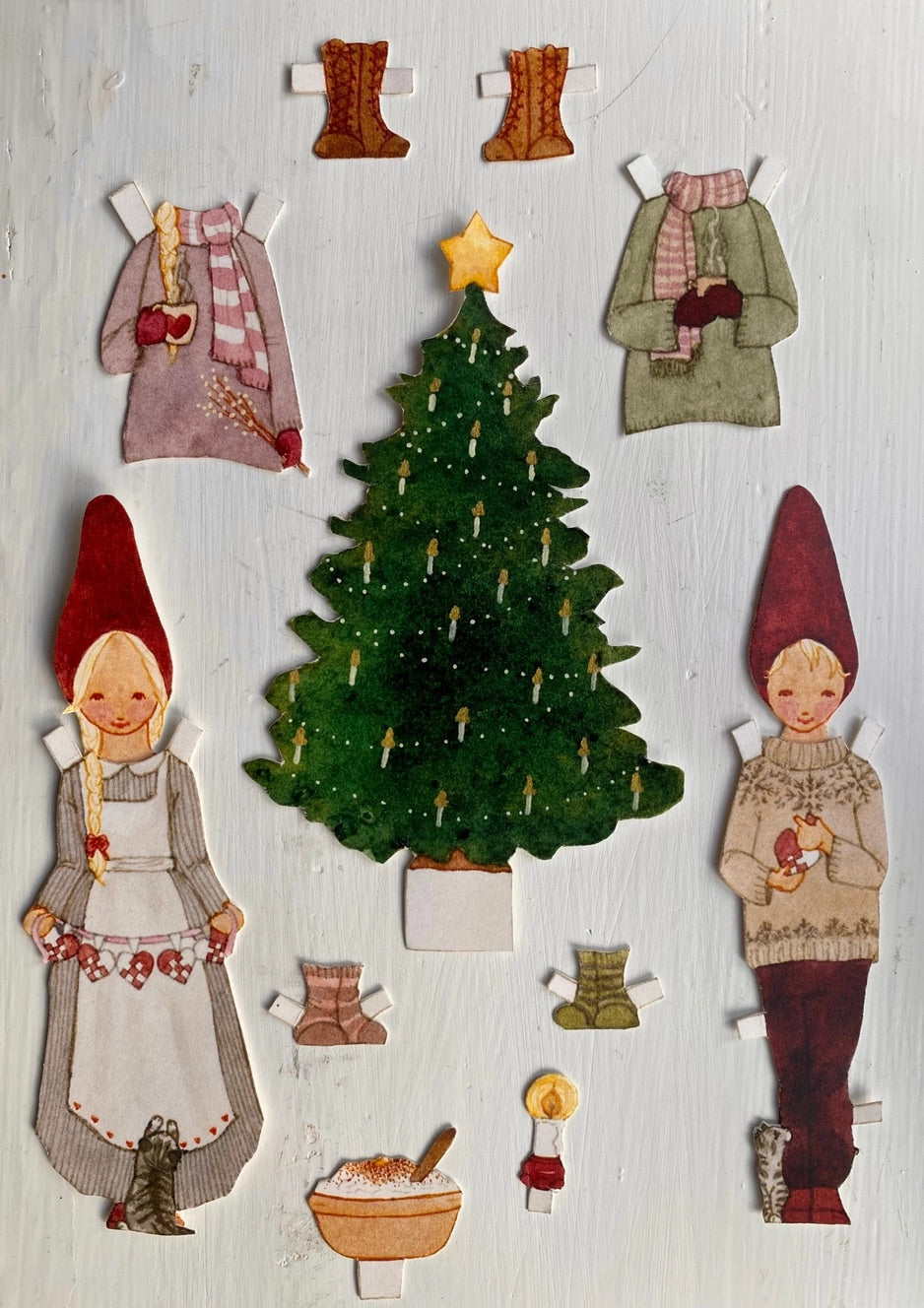 Två små tomtenissar som ser fram emot julen. Klipp ut barnen och klä upp dem för den stora festen! De älskar båda att fläta julhjärtan och dekorera huset. Hjälp dem att laga risgrynsgröten och dekorera julgranen. Eller låt dem hoppa i sina nattkläder och mysa med varm choklad, nattkläder och varma strumpor. Det finns mycket mys och lek i dessa söta klä-upp-tomtenissar. Och de är också riktigt söta som en girland i fönstret eller på dörren. Perfekt som en adventsgåva och för de mysiga dagarna mellan jul och nyår.