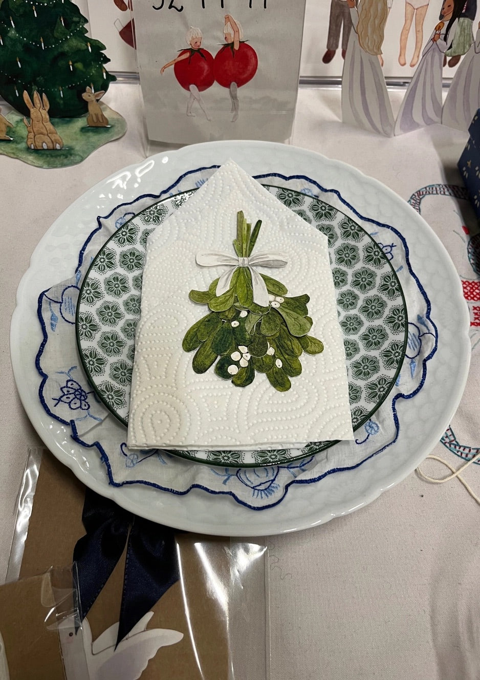 Klipp ut de små bitarna och limma ihop dem i små lager. Använd dem som bordsdekorationer eller knyt ett band eller snöre runt misteln och häng den på en dörrkarm.