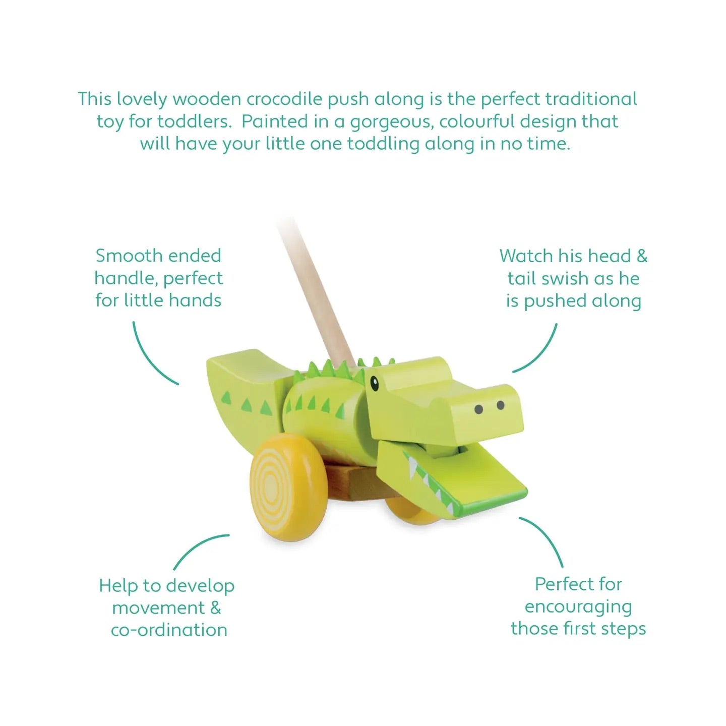 Denna vackra träkrokodil på pinne är den perfekta traditionella leksaken för småbarn!