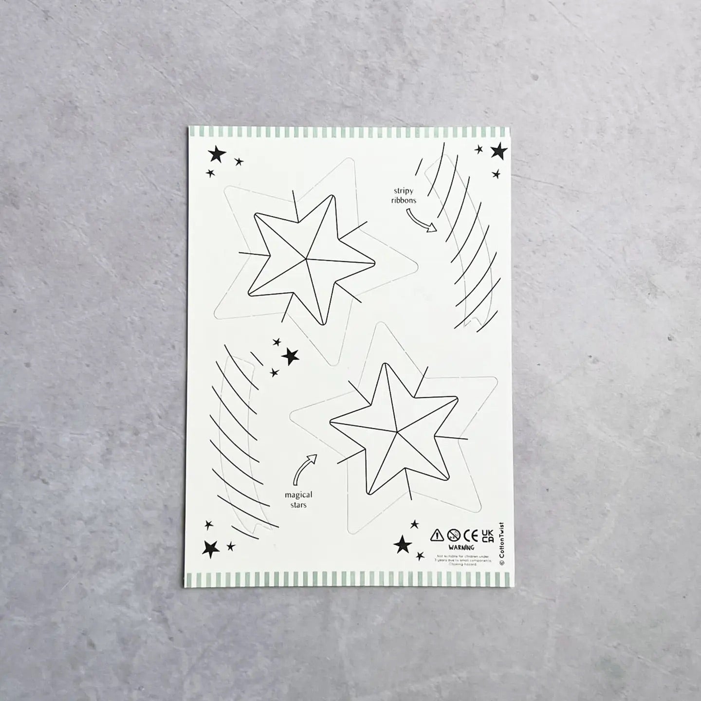 Färglägg stjärnan - och bandutskärningarna, då är det dags att bygga din trollstav. När pinnen och banden är tejpade på kan stjärnorna fästas ihop. Pärlor kan läggas på av banden för ytterligare effekt. Dags att testa din trollstav och sprid magin.