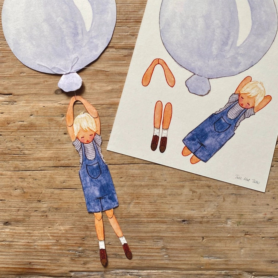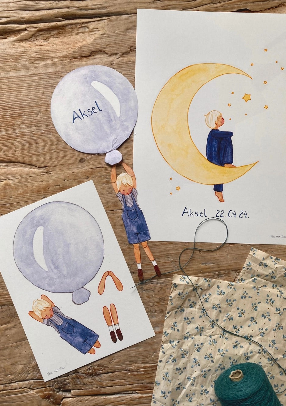 Det finns något drömskt med barn som hänger i en ballong - på väg ut i världen för nya äventyr. Klipp ut den lilla pojken och häng honom på dörren till barnkammaren, bredvid en favoritbild eller ovanför sängen. Du kan också skriva ett namn i ballongen och använda honom som en extra liten överraskning till en födelsedagspresent till någon speciell.