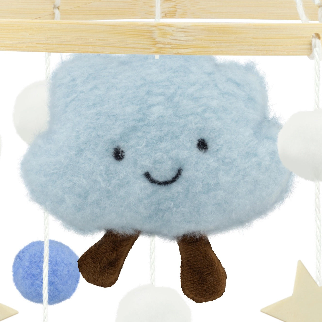 Lägg till en touch av magi i barnets rum med denna handgjorda filt mobil. De olika elementen är upphängda från träbågen. Denna mobil har 19 filtelement (3 moln och 16 bollar), 3 stjärnor och 3 träbollar och slutligen 3 metallklockor.