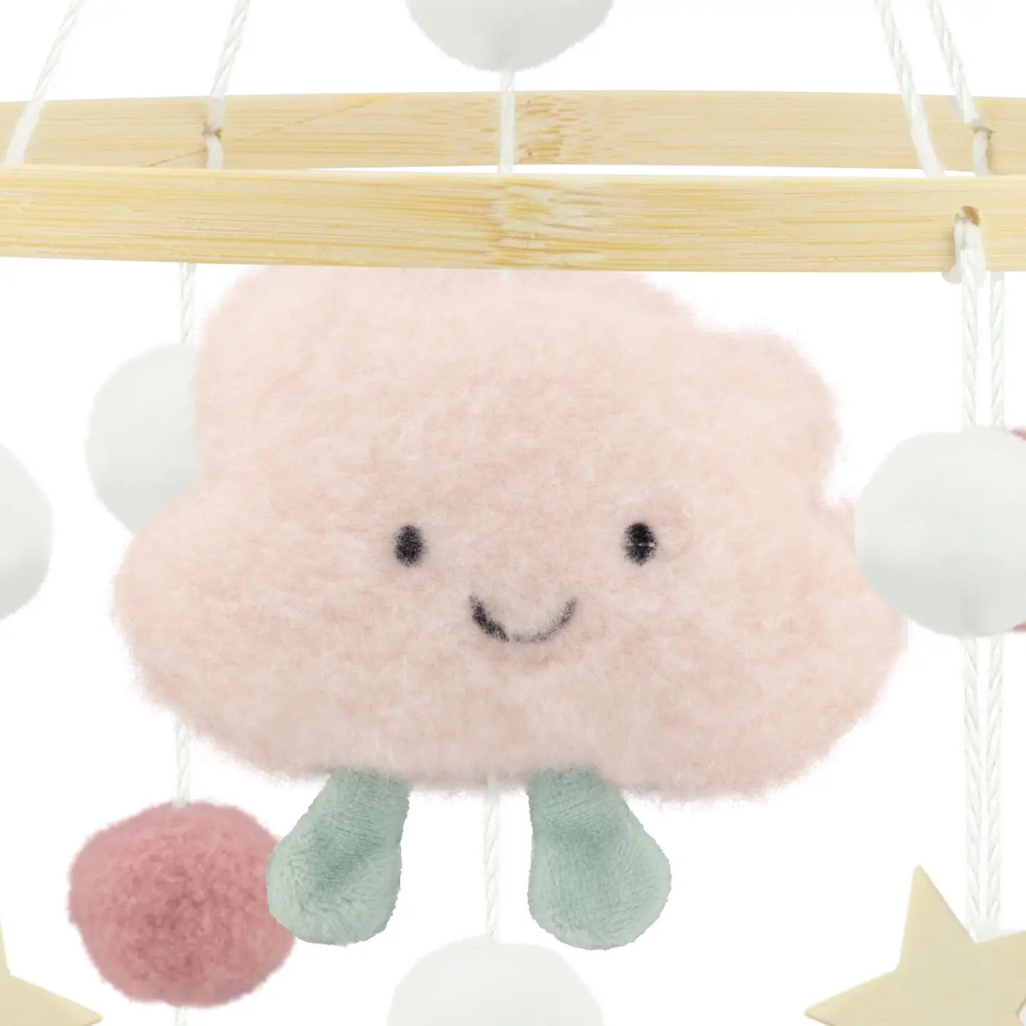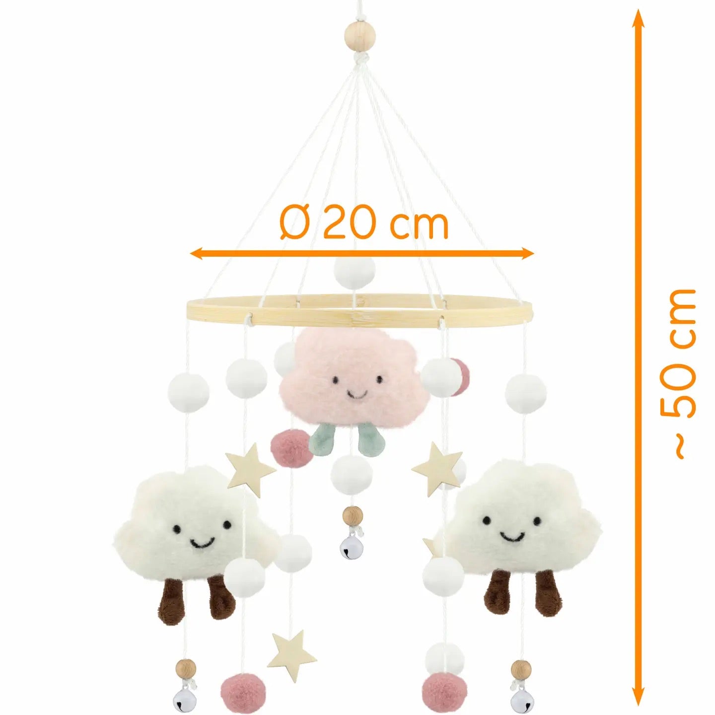 Lägg till en touch av magi i barnets rum med denna handgjorda filt mobil. De olika elementen är upphängda från träbågen. Denna mobil har 19 filtelement (3 moln och 16 bollar), 3 stjärnor och 3 träbollar och slutligen 3 metallklockor.
