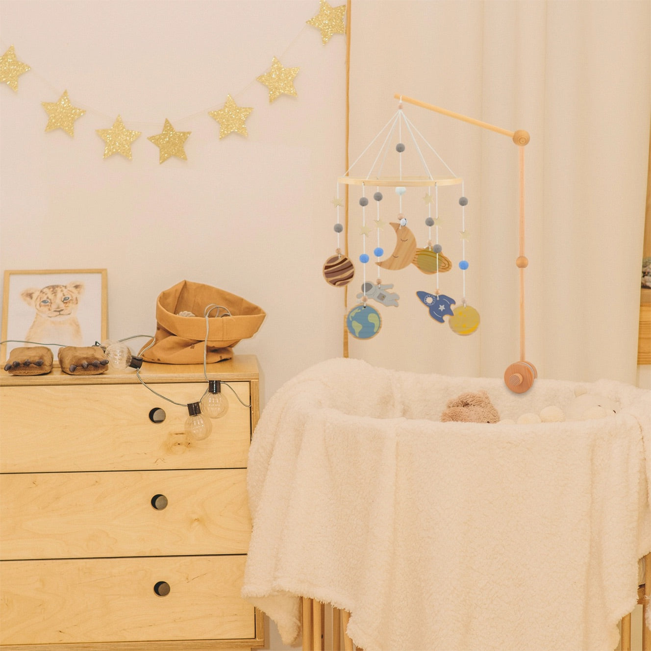 Lägg till en touch av magi i ditt barns rum med denna handgjorda trä- och filtmobil. De olika elementen är upphängda från träbågen. Denna mobil har 20 träelement: 6 stjärnor, 7 kulor, 4 planeter, 1 halvmåne, 1 astronaut och 1 raket. Det finns också 11 filtbollar och slutligen en liten metallklocka.