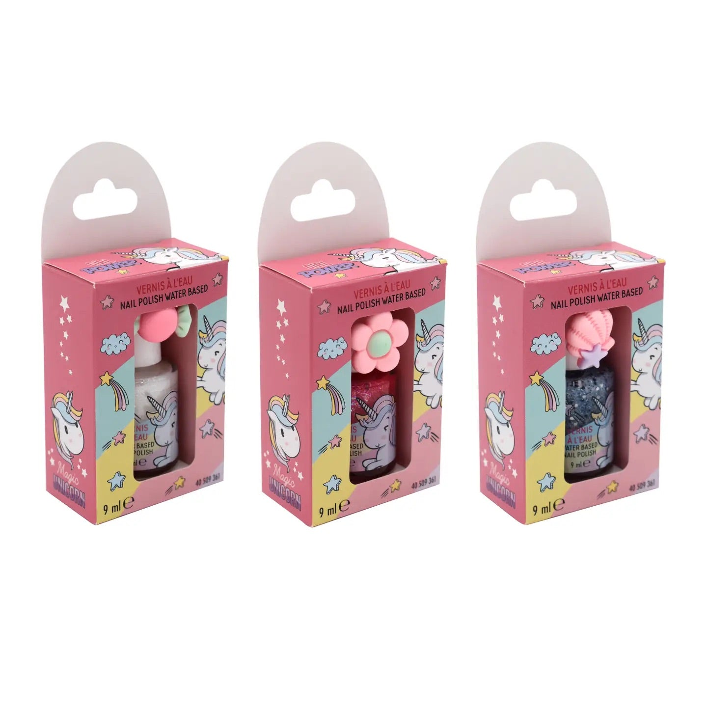 Vattenbaserad lack lätt att applicera, kan avlägsnas med varmt vatten. Rosa glitter, blått glitter, eller pärlvit.