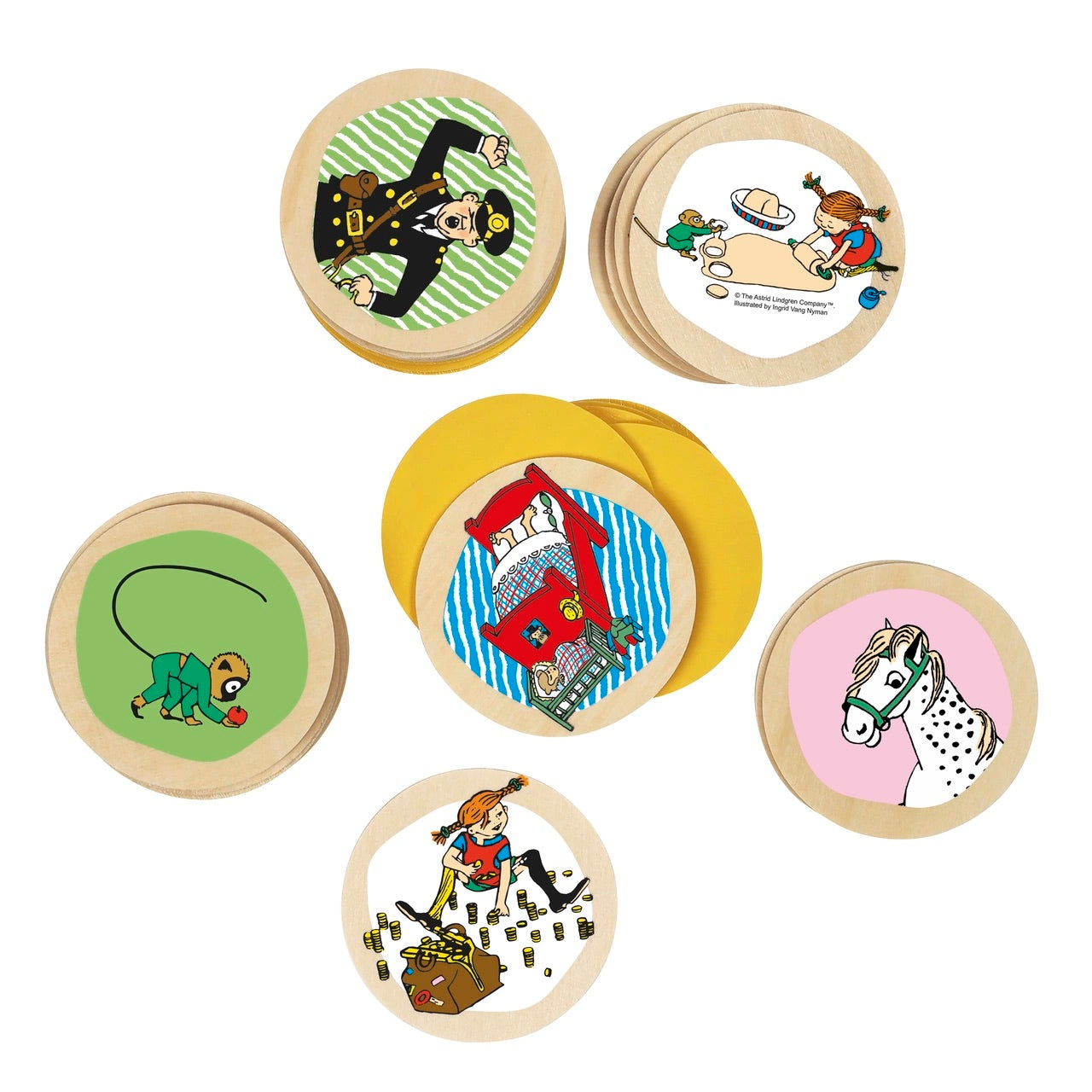 Roliga spel för barn från Pippi! Spelet går ut på att med sitt goda minne samla ihop flest matchande par. Memospelet är i trä och innehåller 38 runda brickor (19 par) med Pippimotiv och spelregler. Ett roligt spel för barn som bjuder på lekfullt kul för hela familjen! Spelreglerna hittar du i förpackningen. Rekommenderad lekålder: 3+.