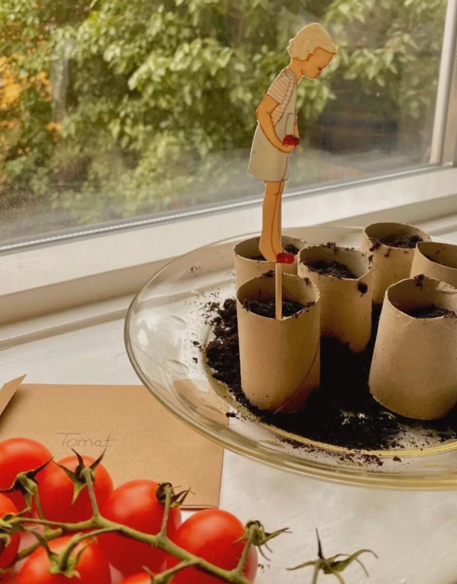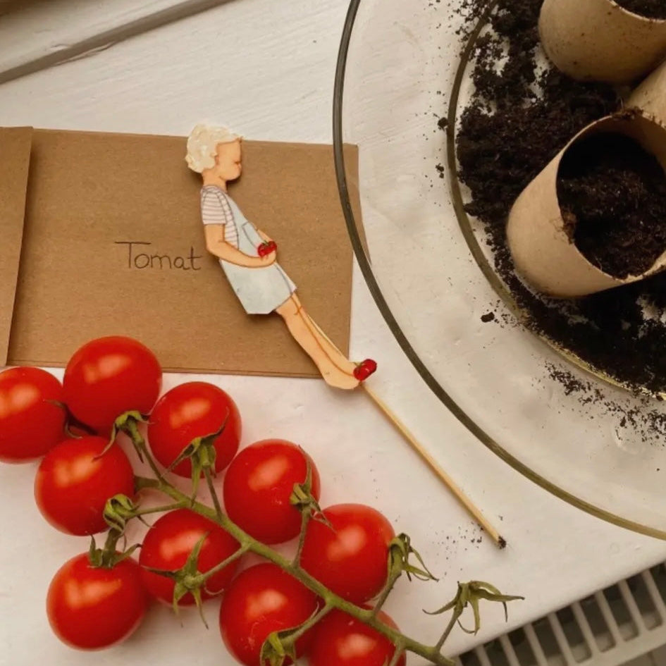 Klipp ut de små barnen, tejpa fast dem på växtpinnarna och placera dem i jorden tillsammans med ditt frö.