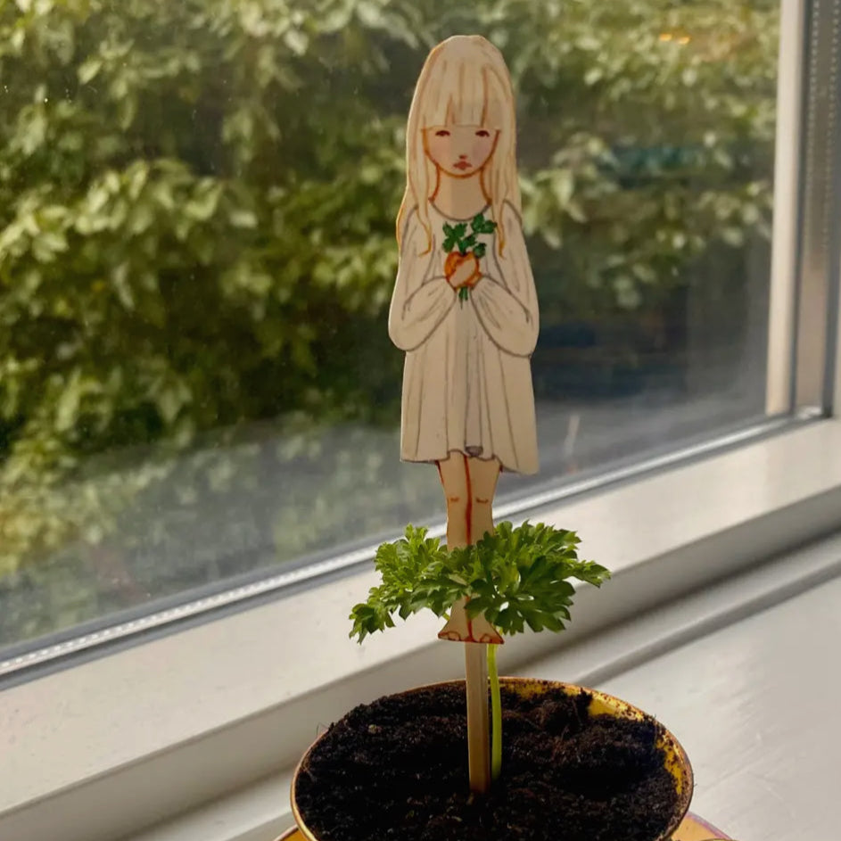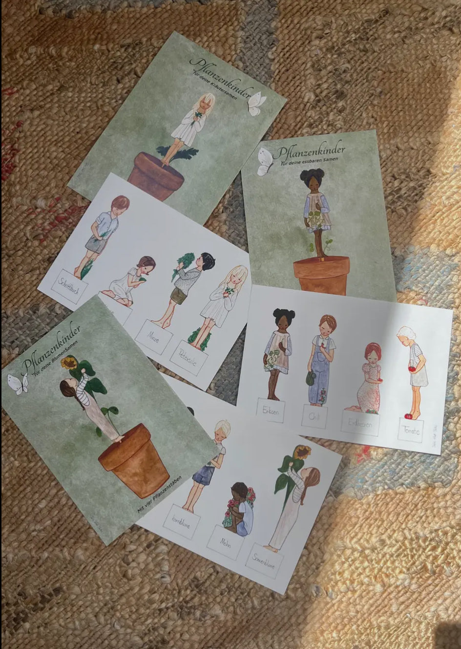 Klipp ut de små barnen, tejpa fast dem på växtpinnarna och placera dem i jorden tillsammans med ditt frö.