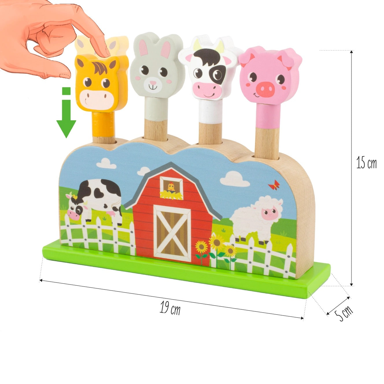 Pop-up leksak som består av en illustrerad bas och 4 pinnar i form av djur. Genom att trycka på karaktärernas huvuden flyttar de från botten till toppen; genom att trycka hårdare kan de till och med hoppa ut ur gömstället! Tryck, släpp, och ta tag!