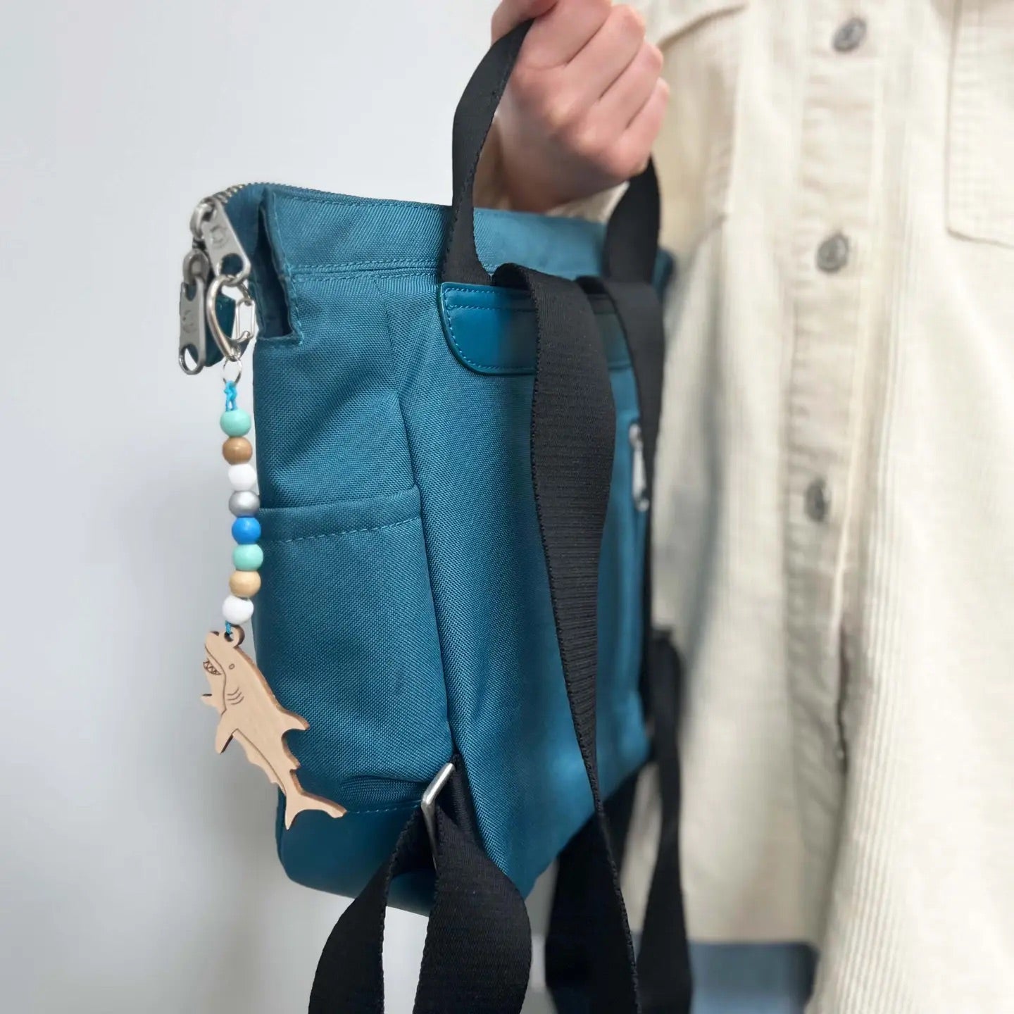 MATERIAL - haj i lönnträ, pärlor i trä, nyckelring, elastiskt snöre med metalländar