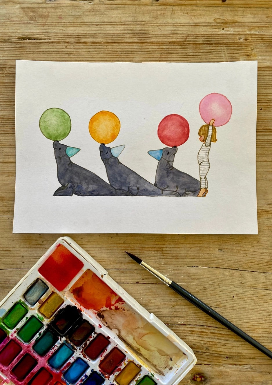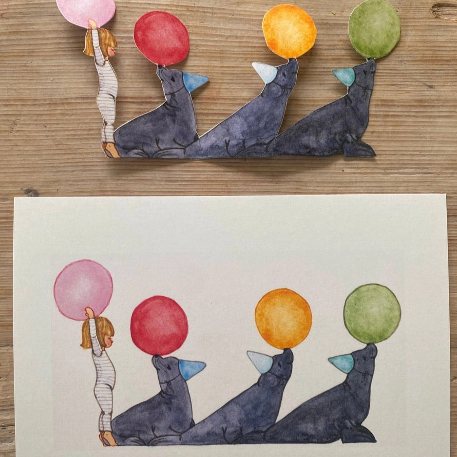 Gör en liten rosett mellan flickan och sjölejonen. Då kommer de att stå bra på bordet.