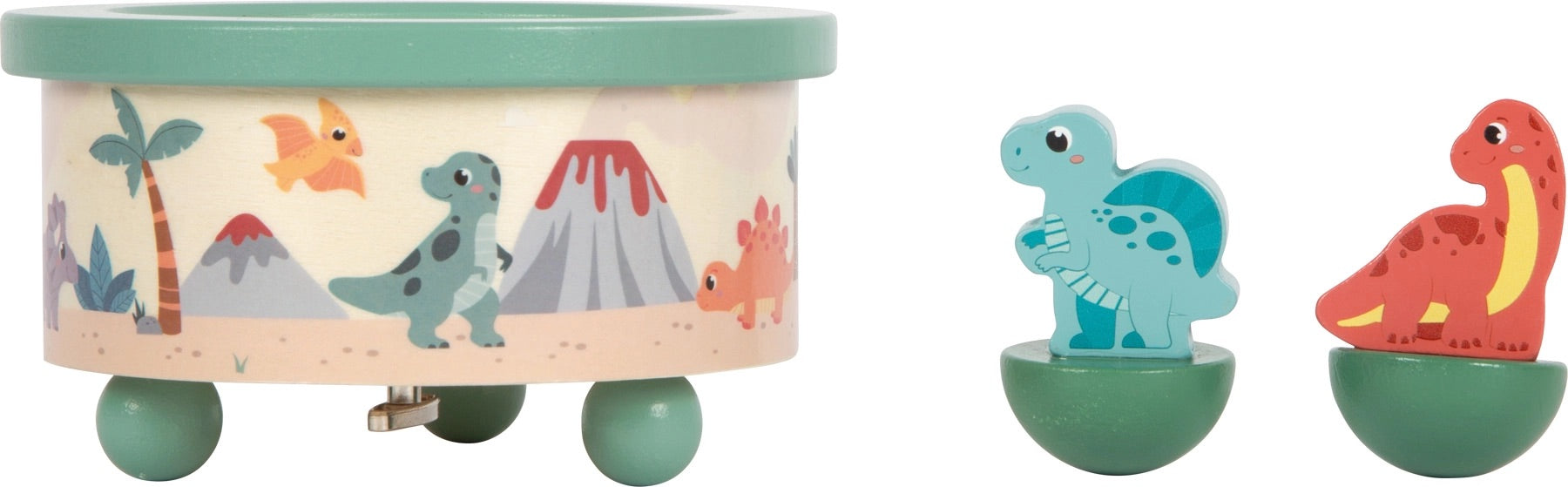 En höjdpunkt för små dinosauriefans är denna speldosa tillverkad av FSC® 100% certifierat trä. De två söta dinosauriefigurerna väcks till liv med den första tonen i karusellvalsmelodin när de försiktigt cirklar runt toppen av musiklådan till ljudet av musiken. De två träfigurerna är avtagbara och tack vare enkel hantering kan dinosauriemusiklådan också manövreras oberoende av barn. Söta detaljer tillsammans med den fantastiska musiken säkerställer avkoppling och följer barnen in i drömmarnas rike. Ett måste för alla små dinosauriefans och samtidigt en dekorativ blickfångare i barnrummet.