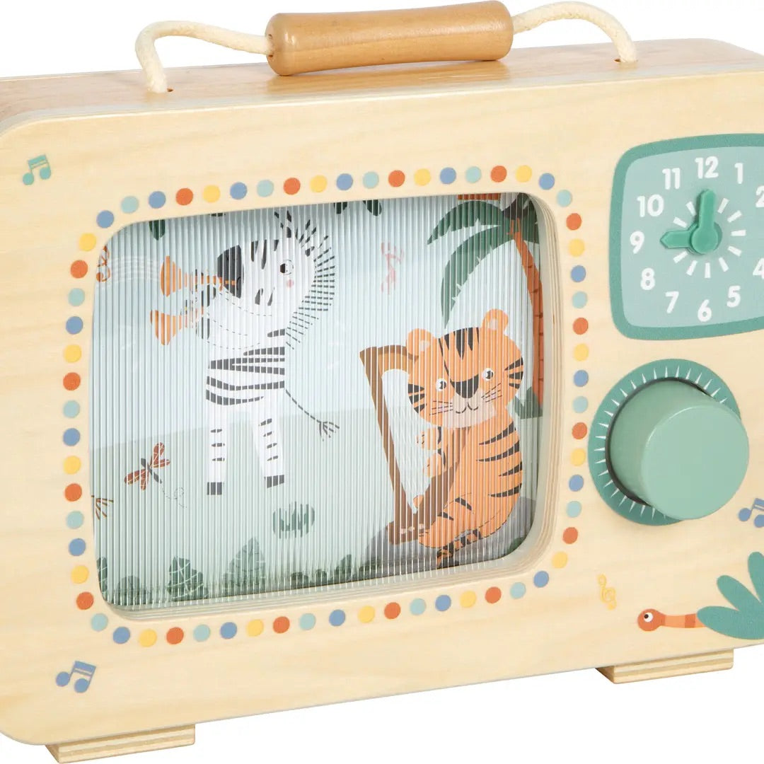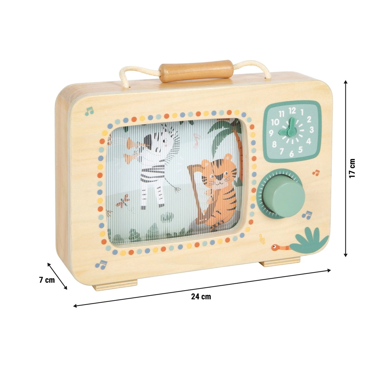 En TV-orkester för barnrummet! Med denna stora speldosa i TV-format av FSC® 100%-certifierat trä får barn uppleva hur orkestern av glada safari-djur kommer till liv. Vrid bara på den greppvänliga knappen, så sätts bild och melodi i rörelse. Den illustrerade panoramabilden roterar i takt med musiken och drar magiskt till sig blickarna! Ett praktiskt handtag gör speldosan perfekt att ta med överallt. Den tryckta klockan med justerbara visare inbjuder dessutom till de första rollspelen kring tid.