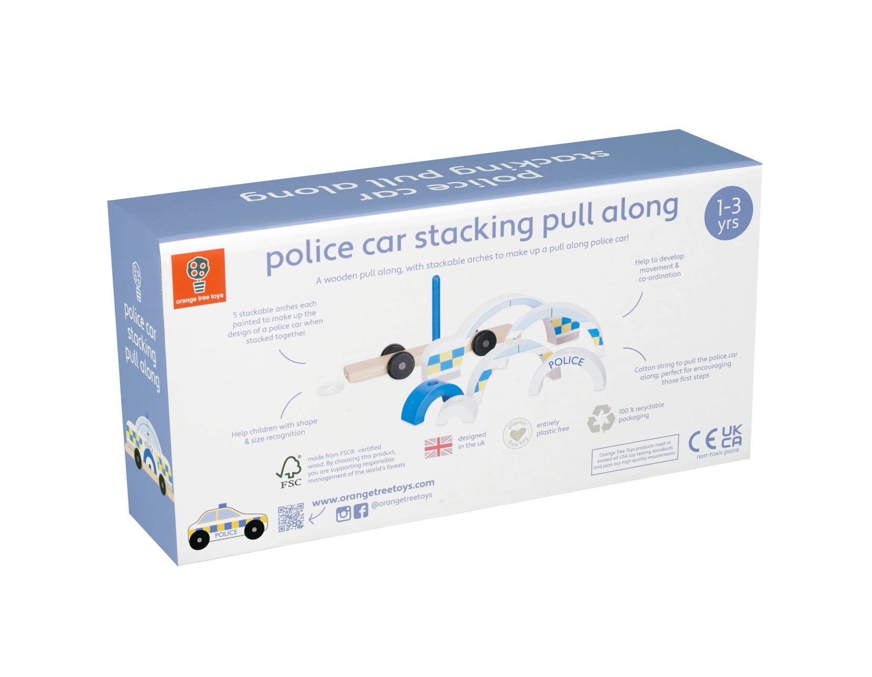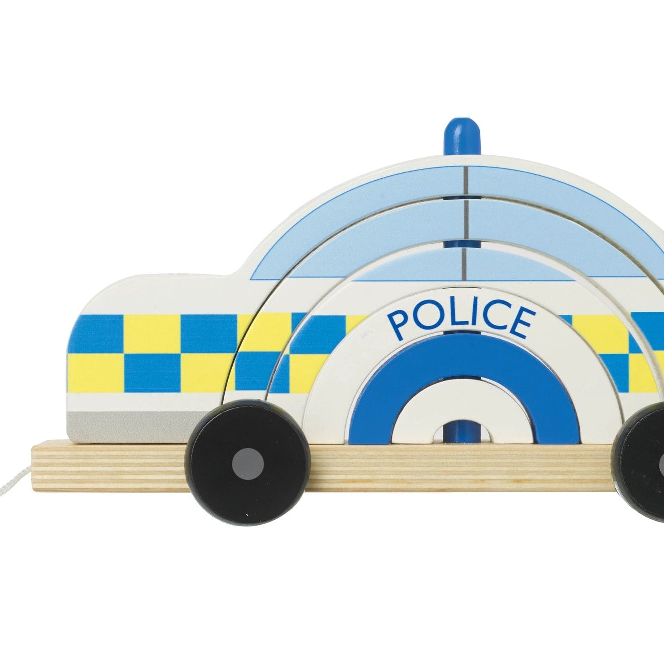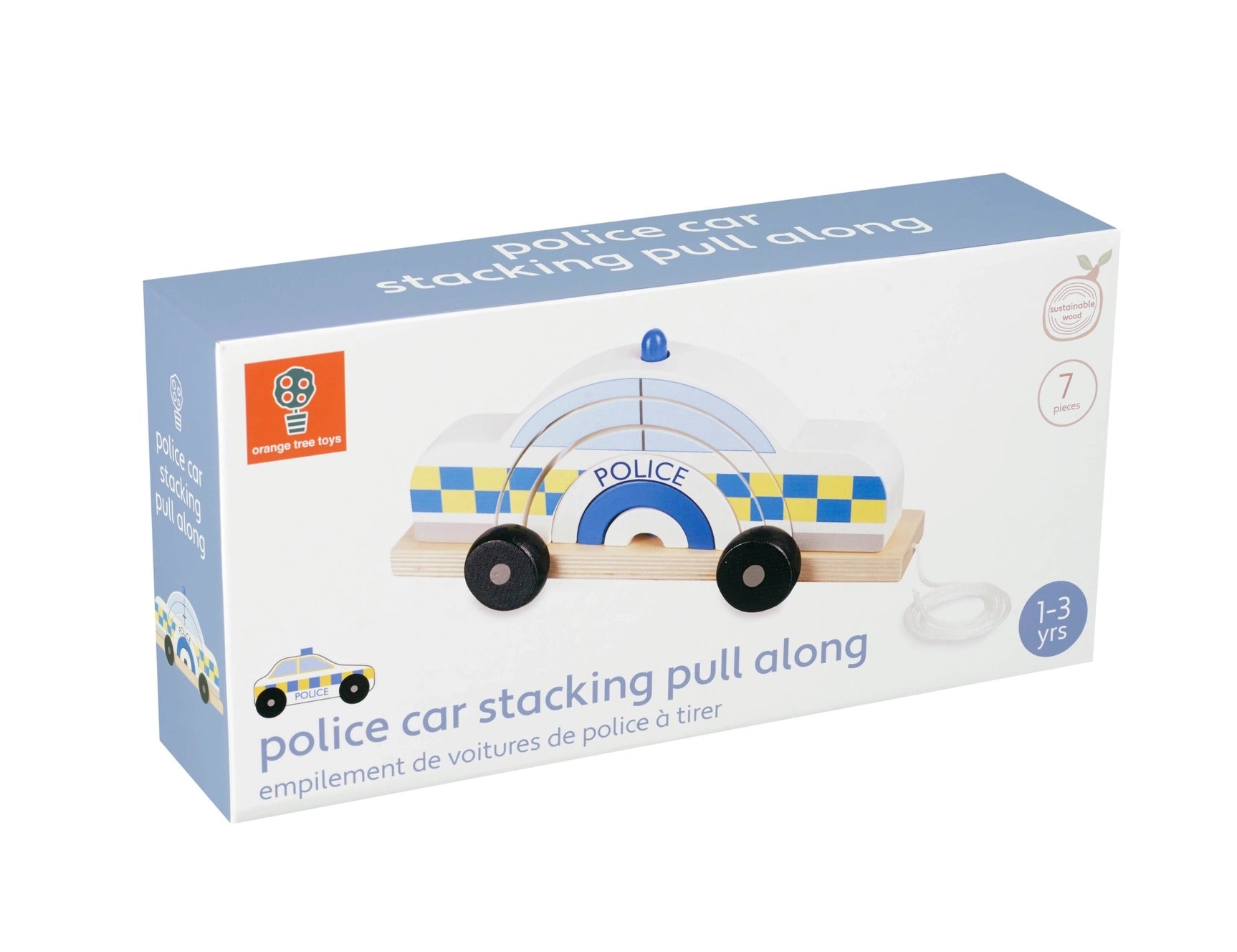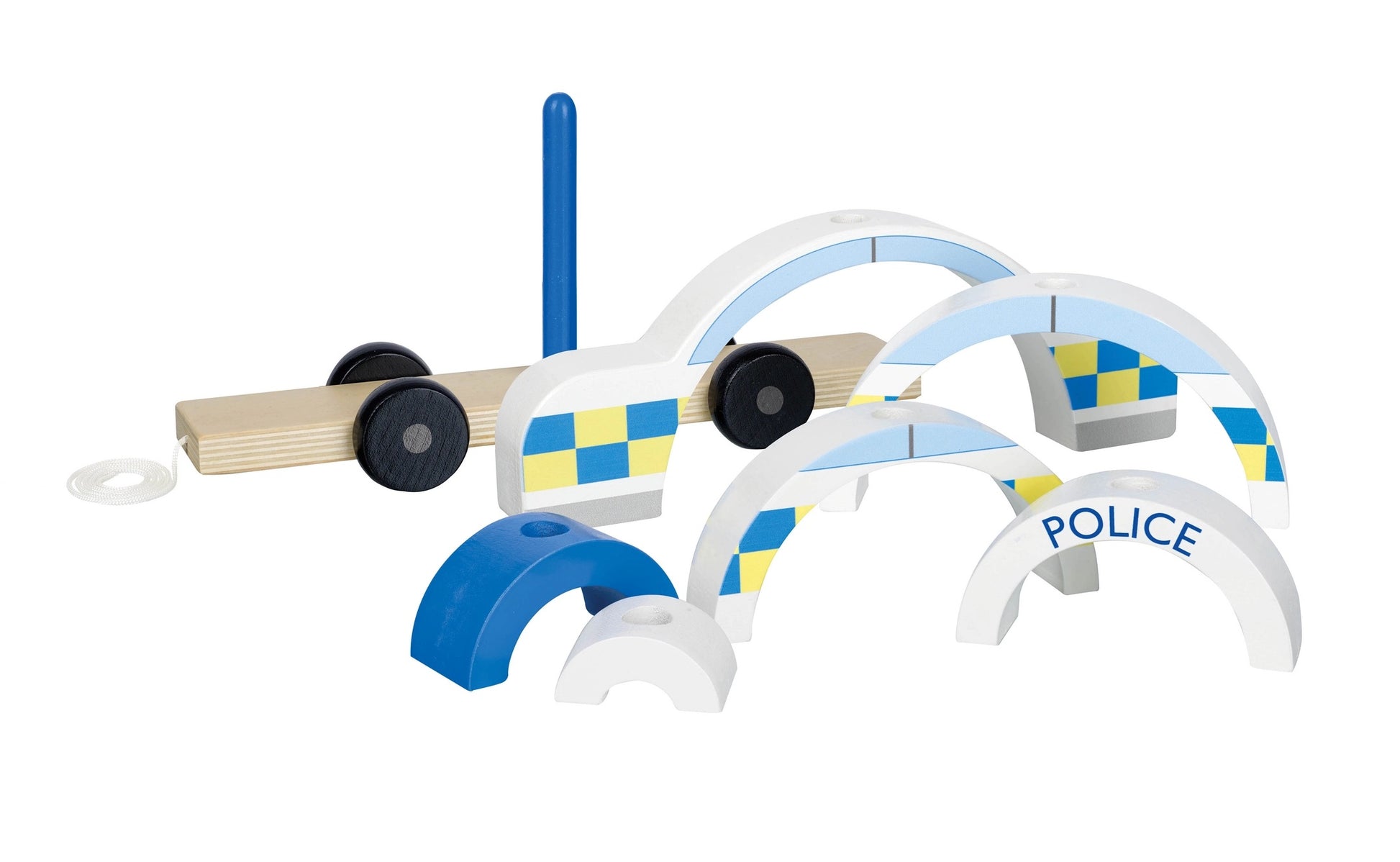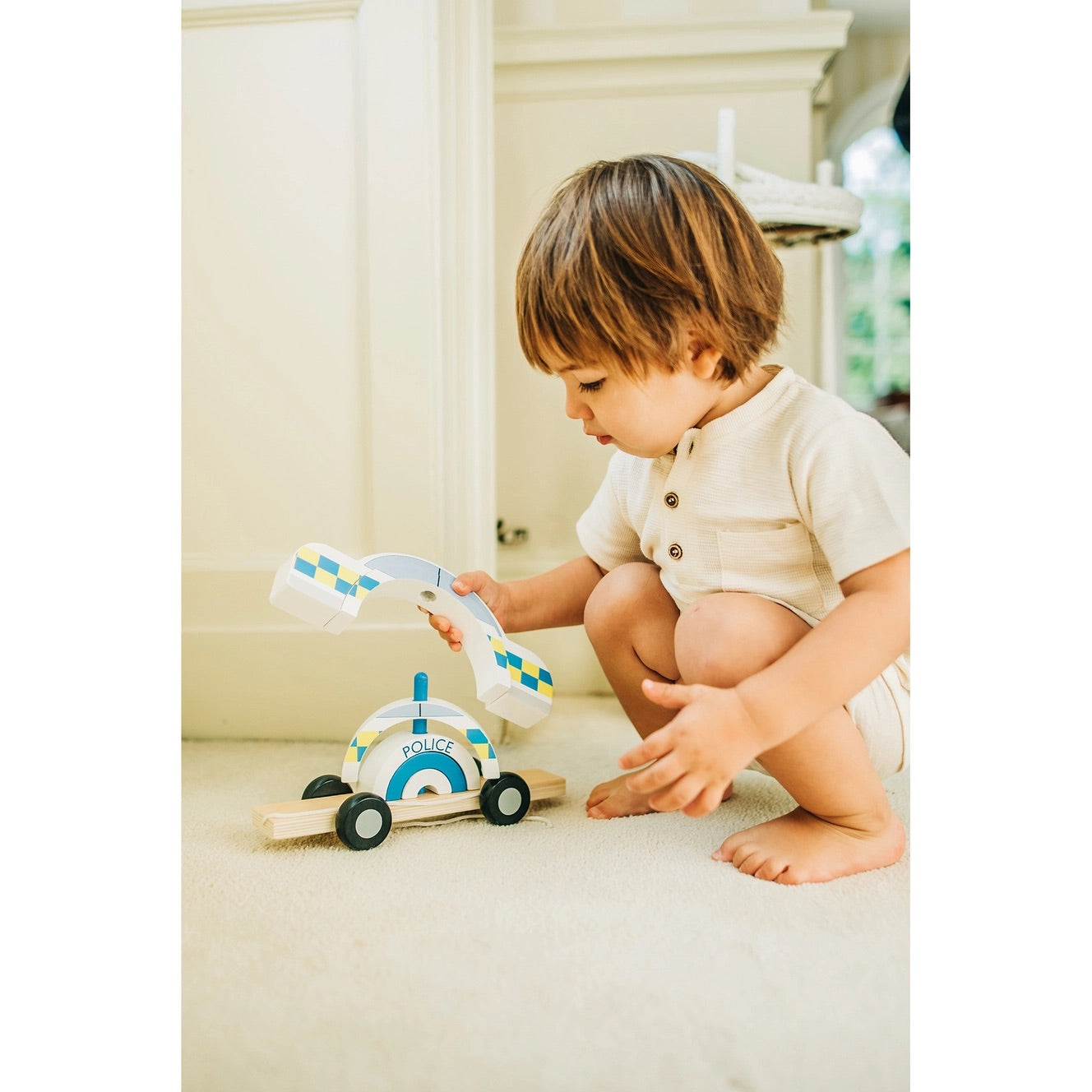 Kombinerad stapel/dra med leksak. Bygg ihop polisbilen och dra med dej den ut på äventyr.