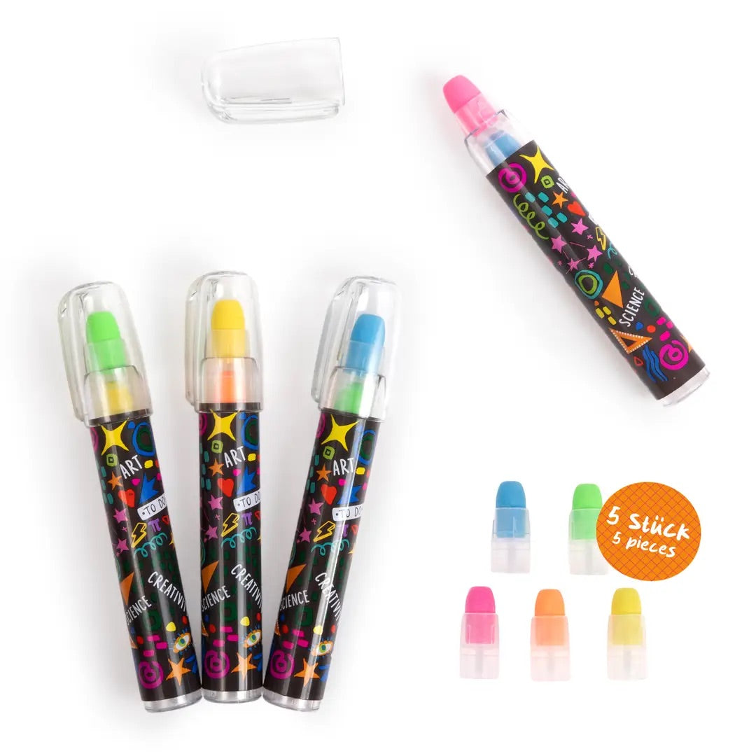 Suddgummipenna, slut på tråkiga suddgummin! Dessa fantastiska drag and stick radergummi i en kreativ design är din perfekta hjälpare i skolan, universitetet eller hemma! Varje penna innehåller 5 individuella suddgummin i färgerna rosa, blå, gul, grön och orange. Dessa kan skjutas ut individuellt från botten till topp.