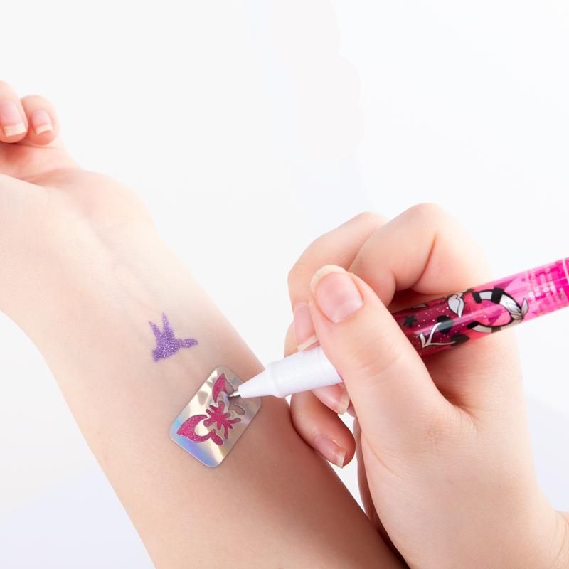 Var kreativ och dekorera både din hud och papper eller andra material med hjälp av dessa små glittriga gelpennor. Du kan rita upp dina egna mönster eller använda de 12 självhäftande stencilerna som ingår. Setet kommer i en praktisk genomskinlig förvaringsväska som håller reda på alla delarna. Gel-bläcket är testat för hud-kompatibilitet och tatueringarna kan tas bort genom upprepad tvätt med tvål och vatten.