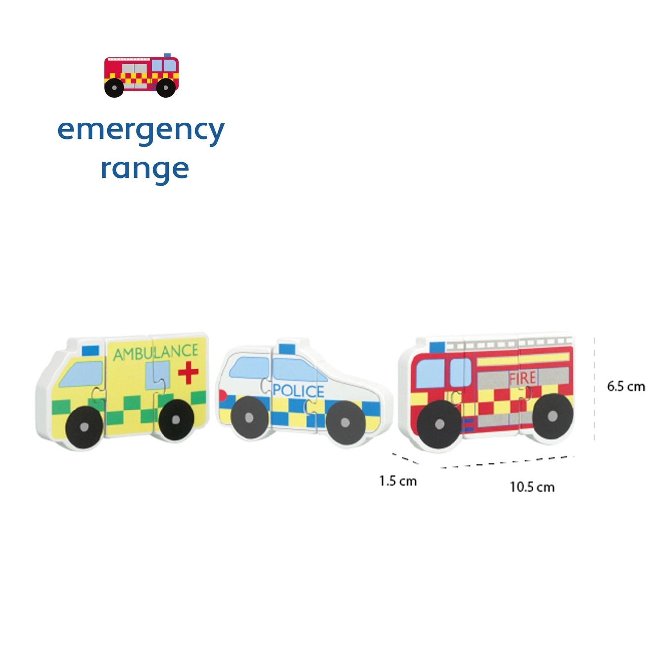En uppsättning träpussel med 3 utryckningsfordon. Varje pussel består av 3 bitar. Setet består av en polisbil, ambulans och brandbil. Varje pussel består av 3 bitar, perfekt för små händer.
