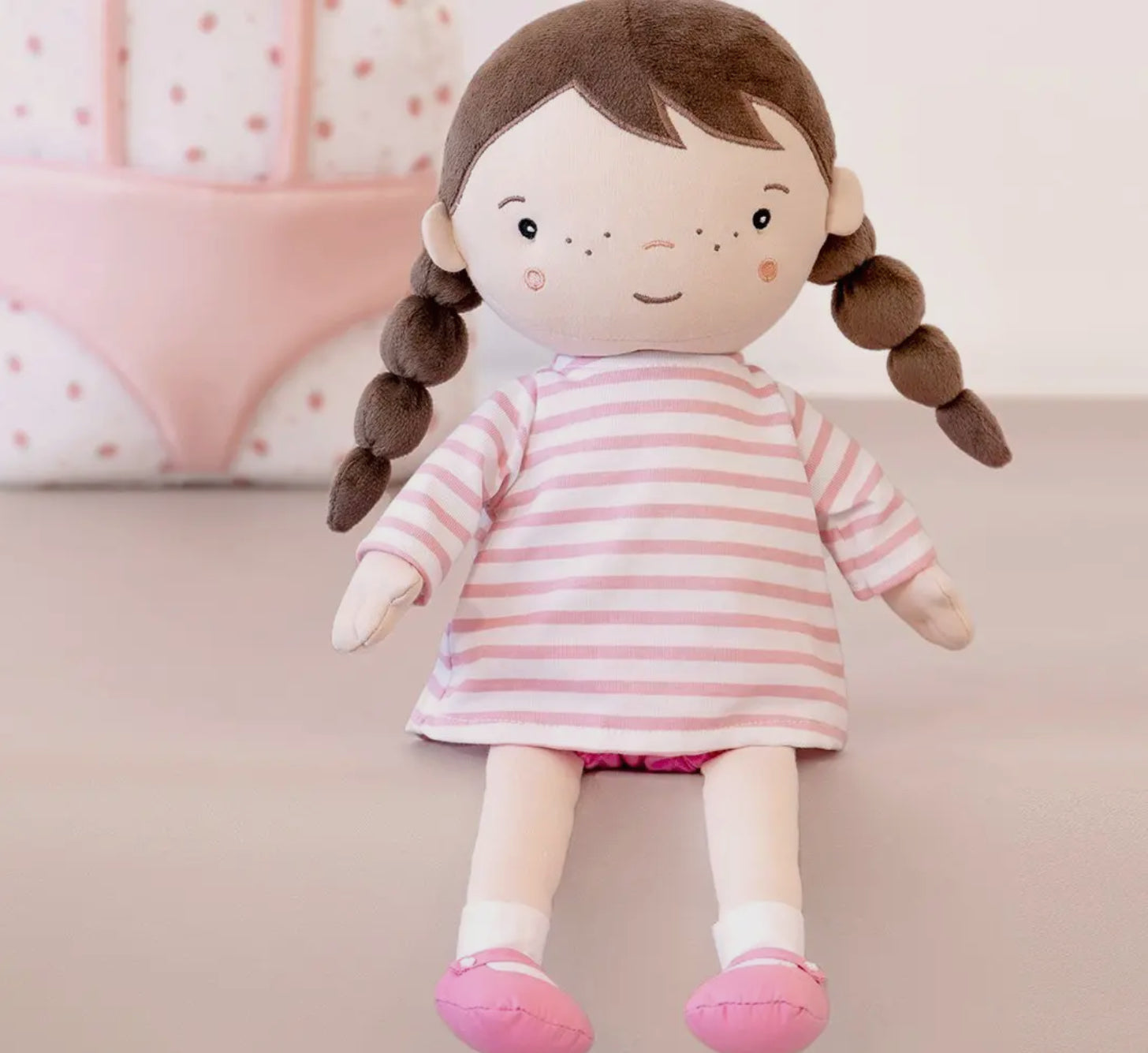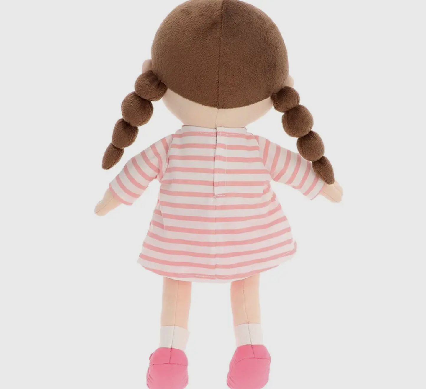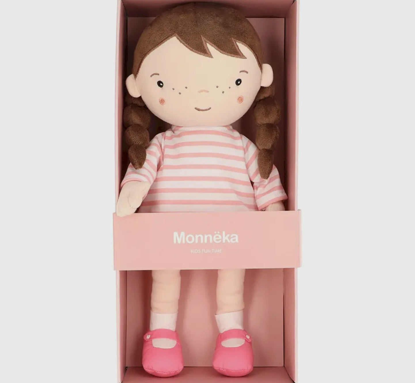 Docka Monnëka Lola: Lola är inte vilken docka som helst, hon är en kram som blivit verklighet. Med sin kropp av 100% bomull och sitt hår av polyester, inbjuder hon till att bli vaggad och älskad. Hennes flätor är 10 cm långa och är essensen av hennes busiga look. Hennes randiga t-shirt och rosa byxor, avtagbara och tvättbara, lovar roligt och mode. Lola är vänlig från första dagen i livet och uppfyller alla säkerhetsföreskrifter.