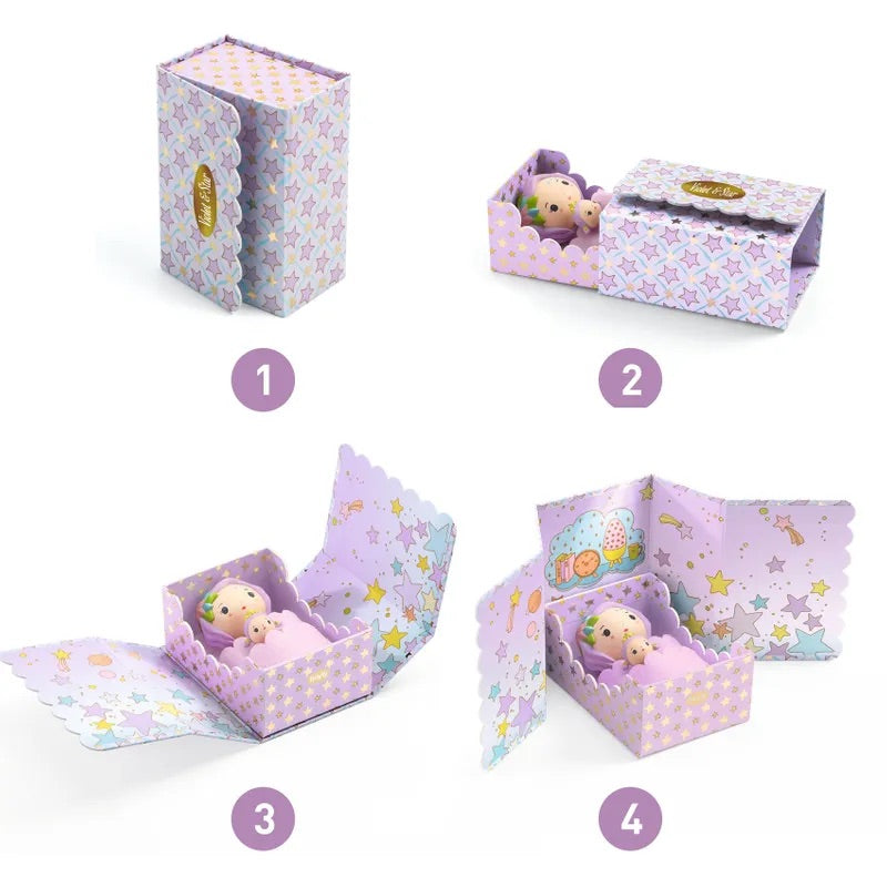Denna lilla ask med sina snygga metallglänsande detaljer och magnetiska stängning förvandlas lekande lätt till ett bedårande sovrum för Violet och hennes lilla följeslagare Star. Ett underbart rum i miniatyr med en härlig design och en liten säng där figurinerna kan ligga och mysa under täcket. Askens omslag kan öppnas upp för att förvandlas till en vikvägg med stjärnbeströdd tapet och en förtjusande bild av ett sött sovrum, medan den stadiga asken blir en perfekt säng.